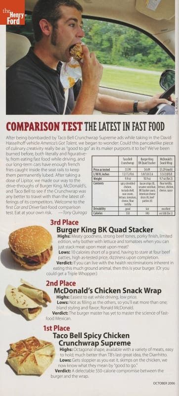 Driving enthusiasts usually turn to Car and Driver magazine for their annual 10 Best list of cars. In this 2006 issue, however, editors ran a comparison test evaluating new fast foods for, among other things, "drivability." Taco Bell's Spicy Chicken Crunchwrap Supreme won.