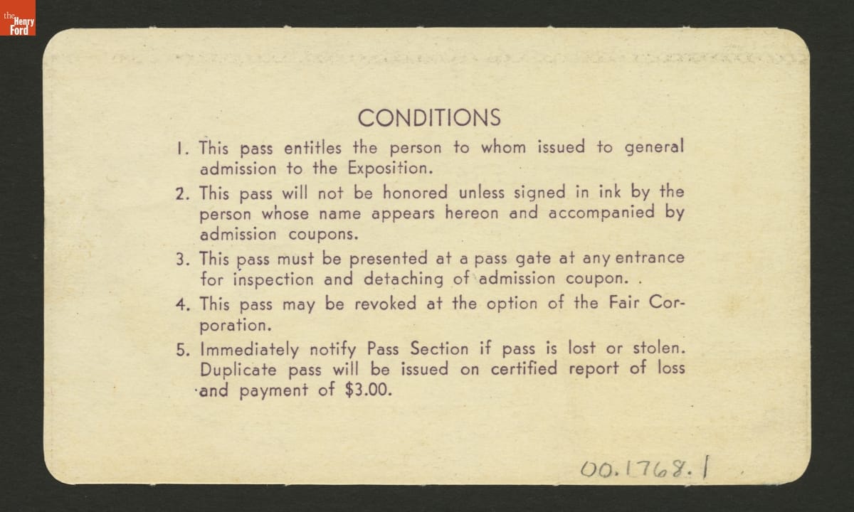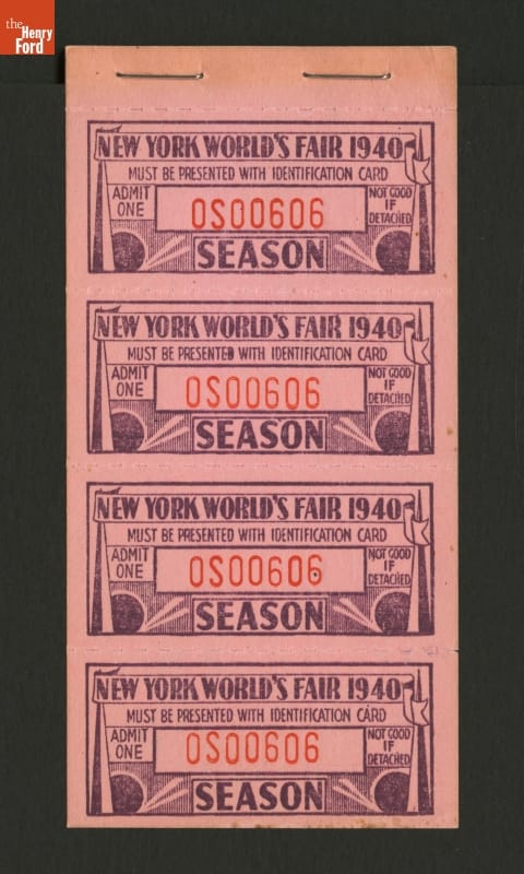This identification card and tickets for the New York World's Fair of 1939-40 were issued to Frank Campsall, Henry Ford's private secretary. The Ford Motor Company Pavilion, echoing the fair's "World of Tomorrow" theme, offered a vision of a technologized, prosperous future.