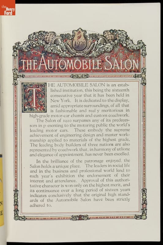 Unlike conventional auto shows aimed at mass-market customers, smaller salon-style shows catered to an exclusive and wealthy clientele. Exceptional American makes like Duesenberg, Packard, and Pierce-Arrow were featured alongside superb European marques like Delage, Panhard, Renault, and Rolls-Royce. Salons typically were held in posh hotels rather than raucous convention centers.