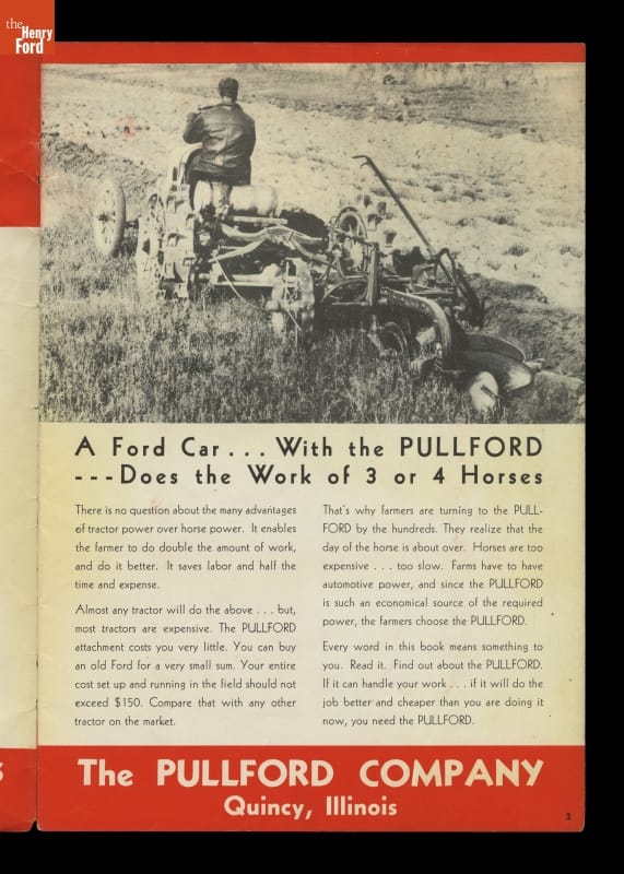 The Pullford Company sold conversion kits that turned Model Ts into tractors. Popular with farmers during the 1920s and 1930s, the kits were a low-cost alternative to buying a tractor.