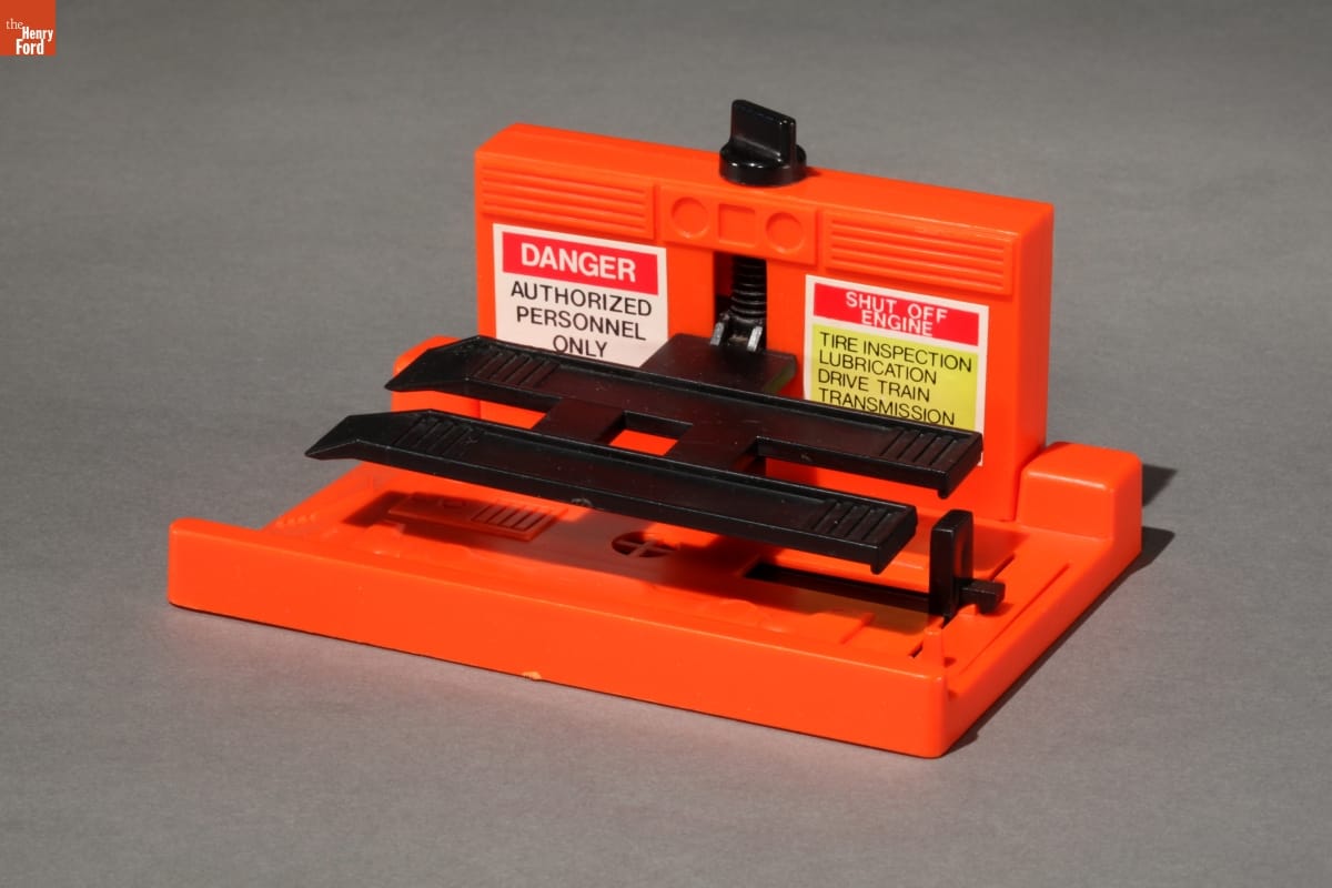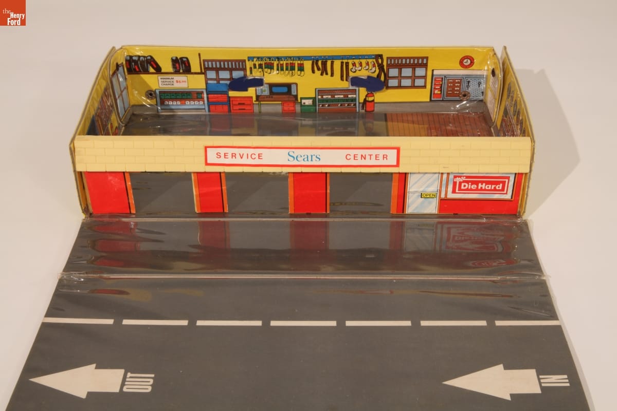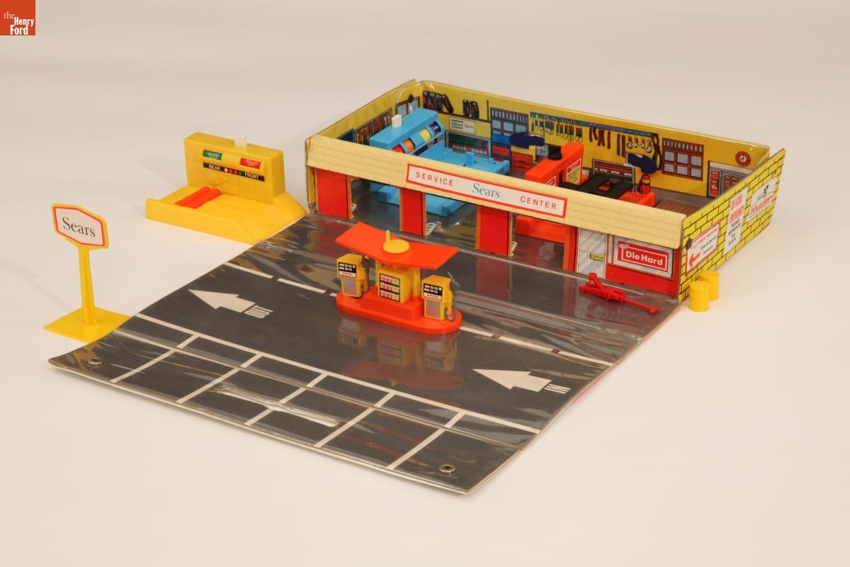By the early 1960s, Sears, J.C. Penney's, Montgomery Ward, and other large department stores offered basic auto maintenance and repair services to their suburban customers in buildings adjacent to their stores. Customers could shop while having their car repaired. For children playing with this toy version, a real-life trip to Sears to have the family car fixed may have been a familiar experience.