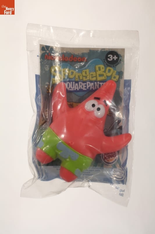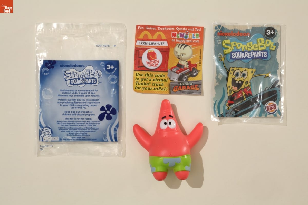 Fast food chains, like Burger King, use television cartoon characters to sell their kids meals. These toys of popular culture icons, like SpongeBob SquarePants' best friend Patrick Star, help influence the family's decision of where to eat. Patrick's pants change color when dipped in cold water.