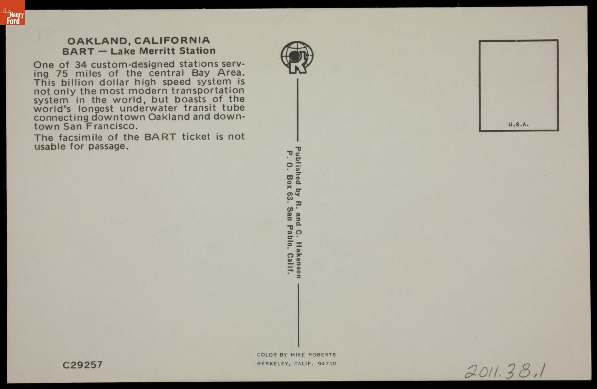 Starting in the 1970s, concerns about traffic congestion, pollution and the plight of cities spurred the construction of new commuter transit systems. This postcard celebrates the 1972 opening of the San Francisco Bay Area Rapid Transit's (BART) Lake Merritt station in Oakland, California. The reproduction BART ticket was "not usable for passage."