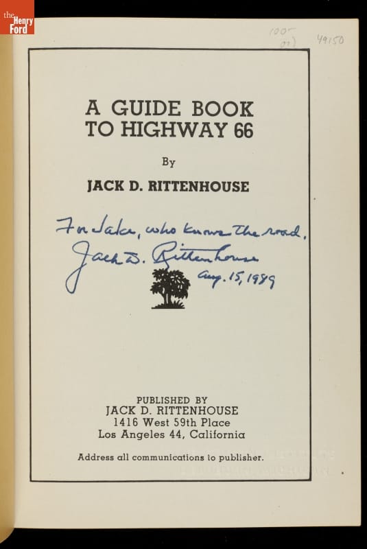Handwritten in ink on title page dated August 15, 1989: "For Jake, who knows the road." (Signed) Jack D. Rittenhouse