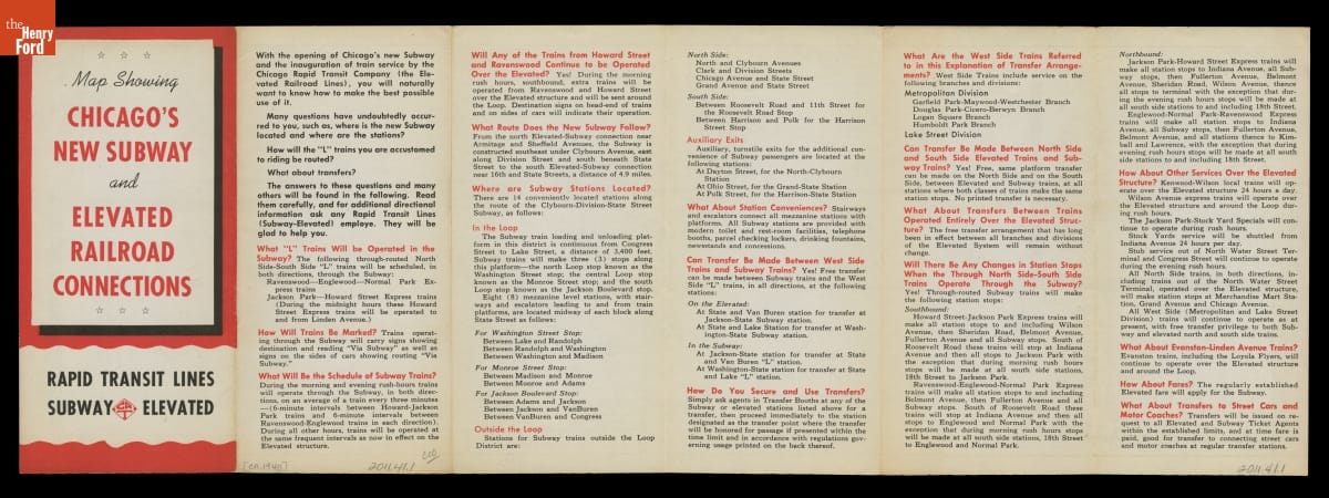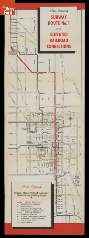 This map introduced Chicagoans to the Chicago Rapid Transit Company's new subway lines, which would complement and relieve traffic on existing surface and elevated rail lines. When the CRT opened their subway lines in 1943, Chicago's rail lines, buses and streetcars were all run by separate, private companies; they merged in 1947 to become the municipally owned Chicago Transit Authority.