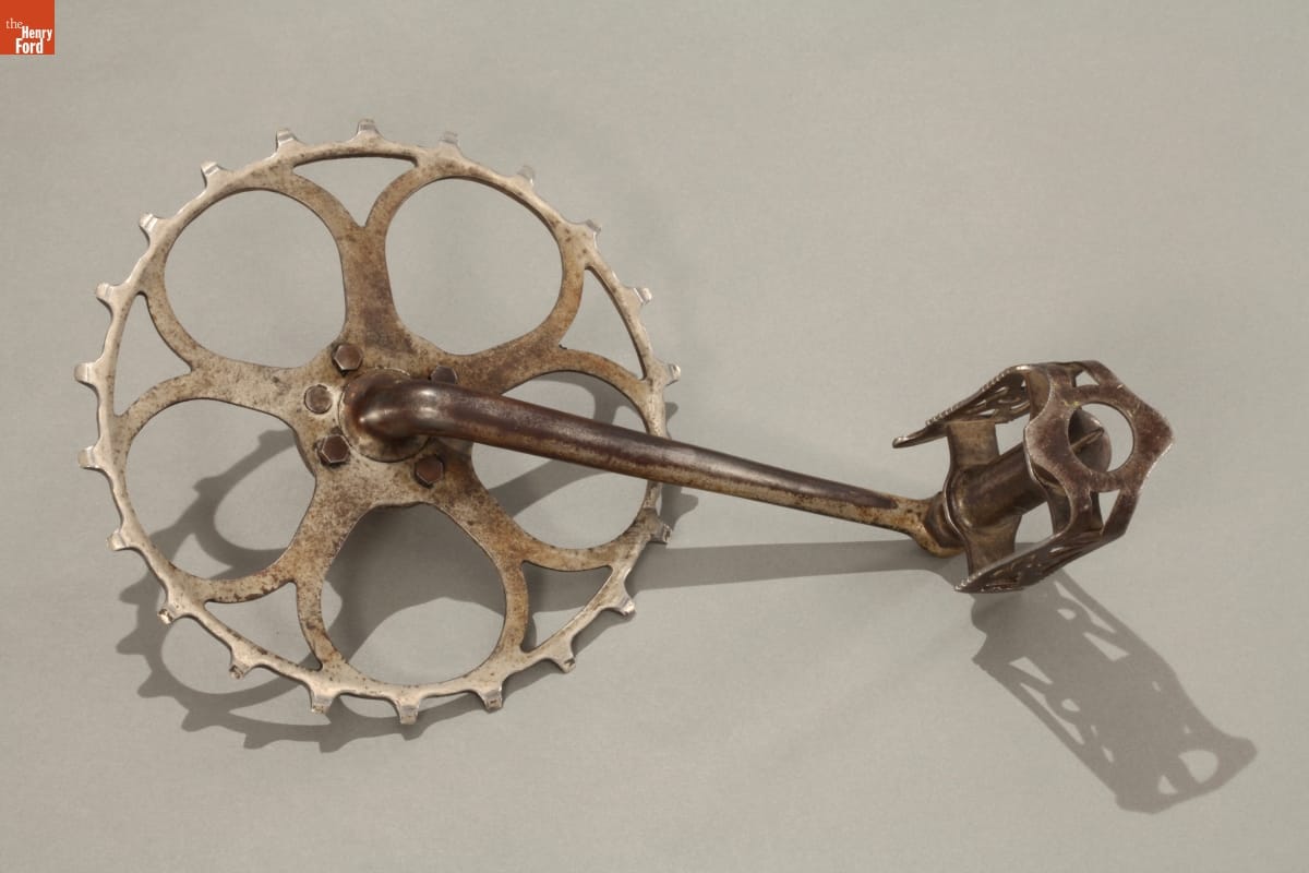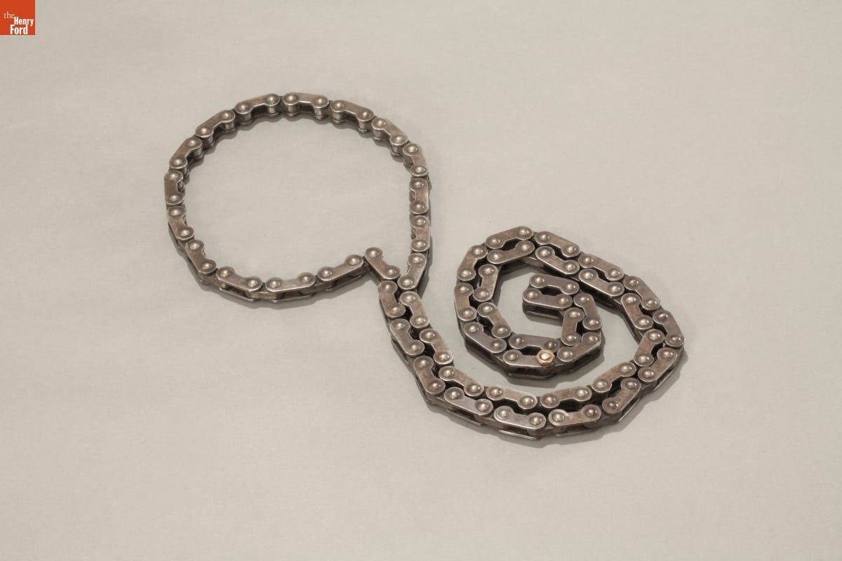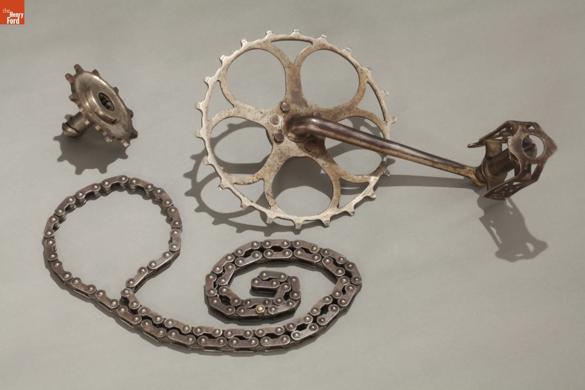 The bicycle industry of the late 19th century became a model and resource for automobile builders everywhere. Inventors used bicycle technology -- such as chain drives, wire-spoked wheels, and pneumatic tires -- in many early autos. These drivetrain components came from an Iver Johnson bicycle made between 1890 and 1910.