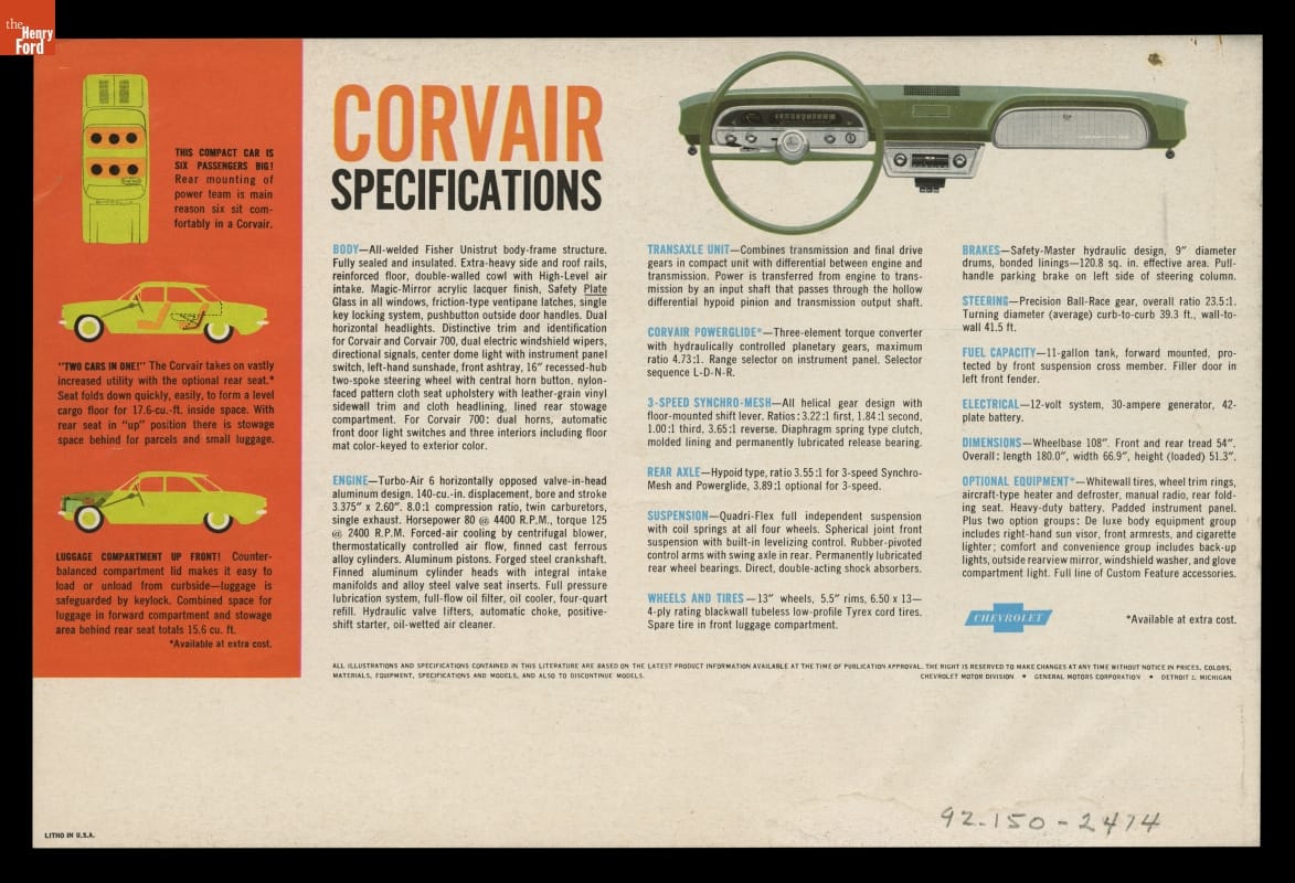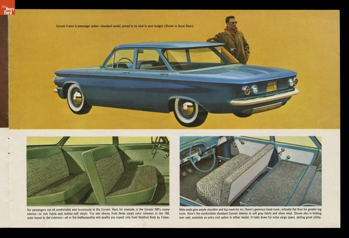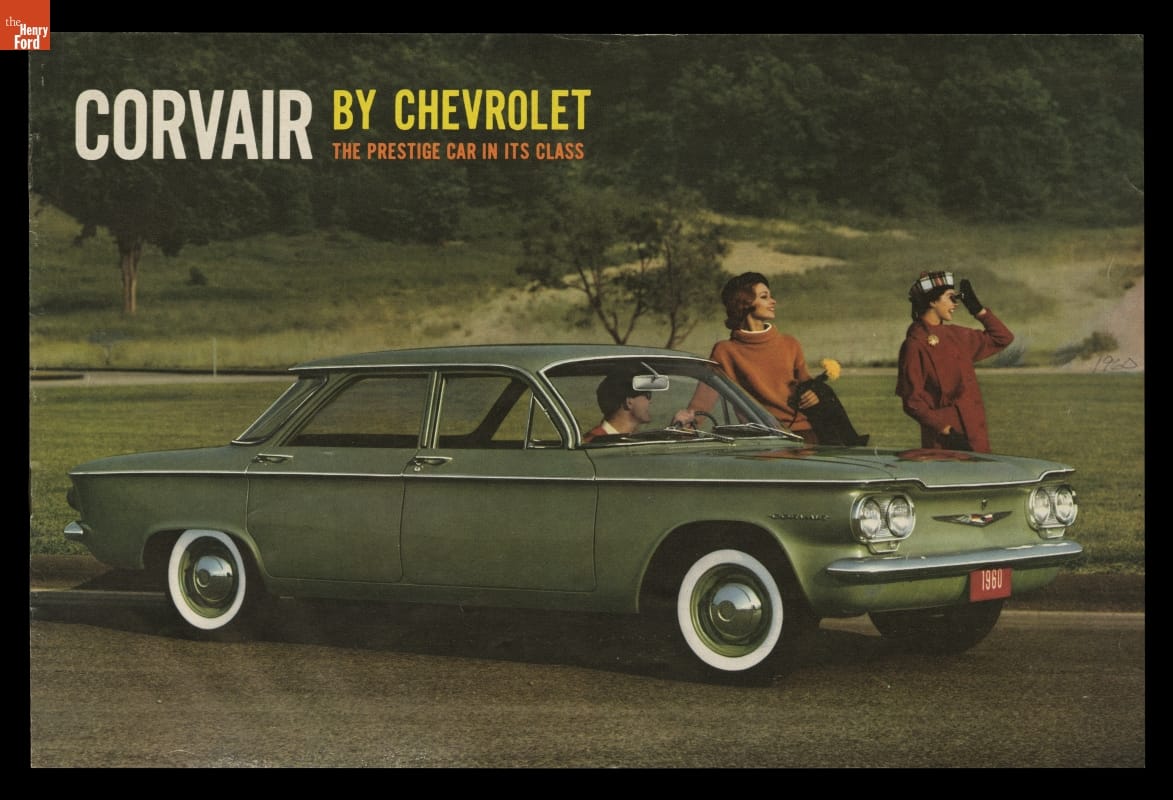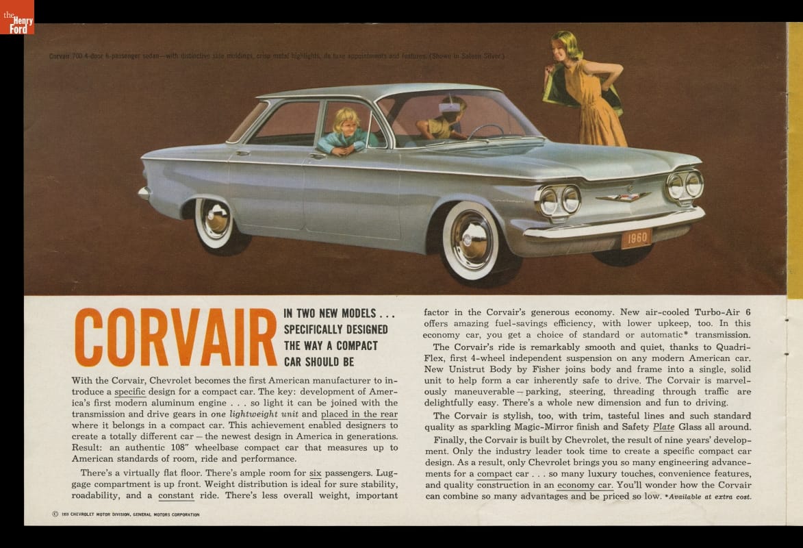 A dramatically styled compact car with a rear-mounted engine, the 1960 Chevrolet Corvair was something different from Detroit's Big Three automakers. This sales brochure shows the ins and outs of what General Motors called "The Prestige Car in its Class."