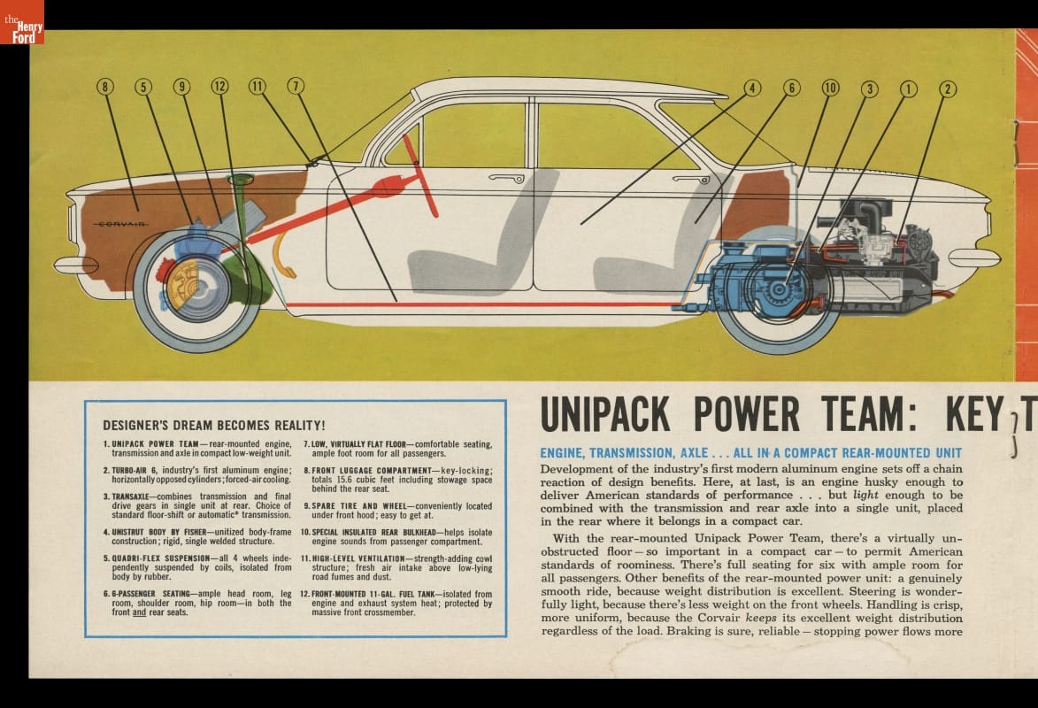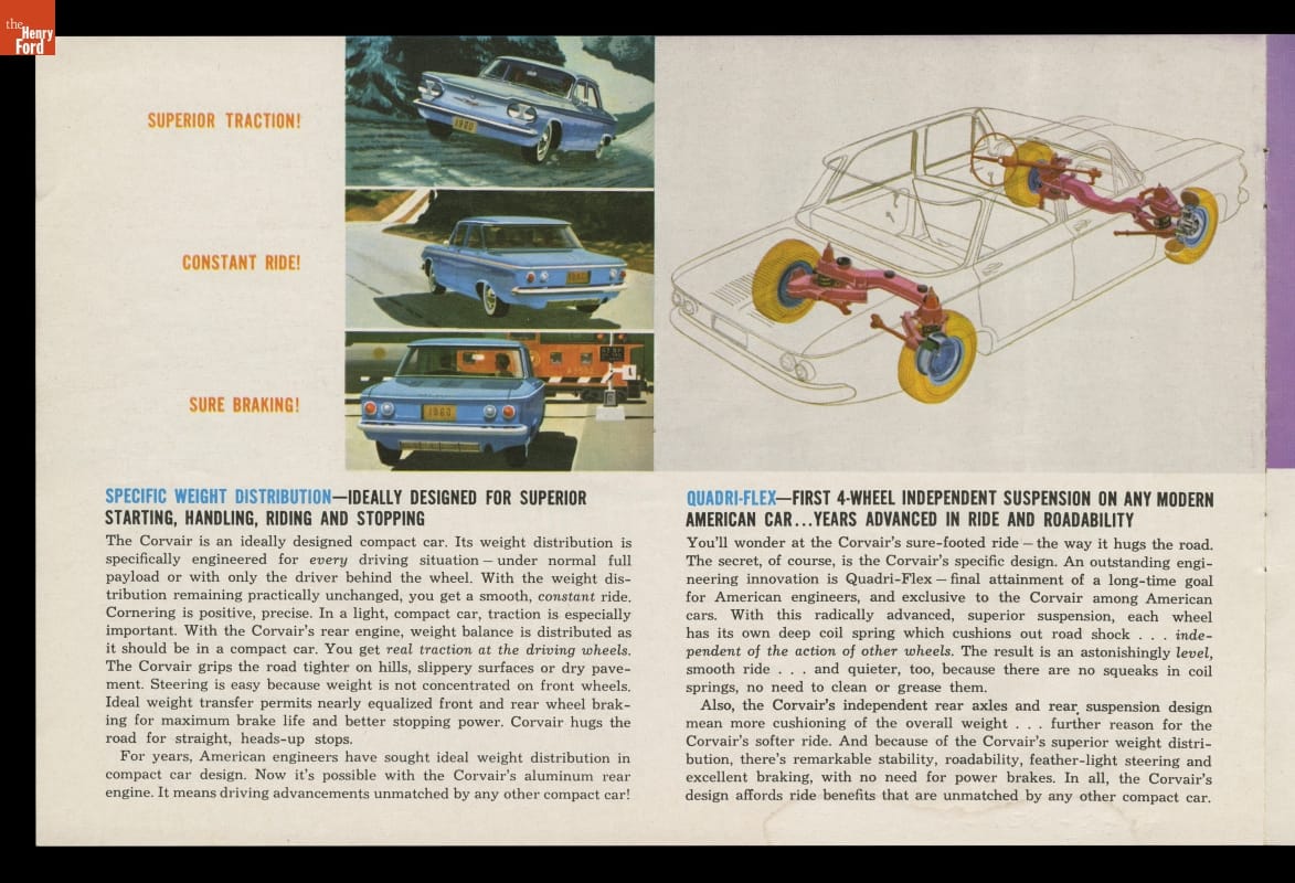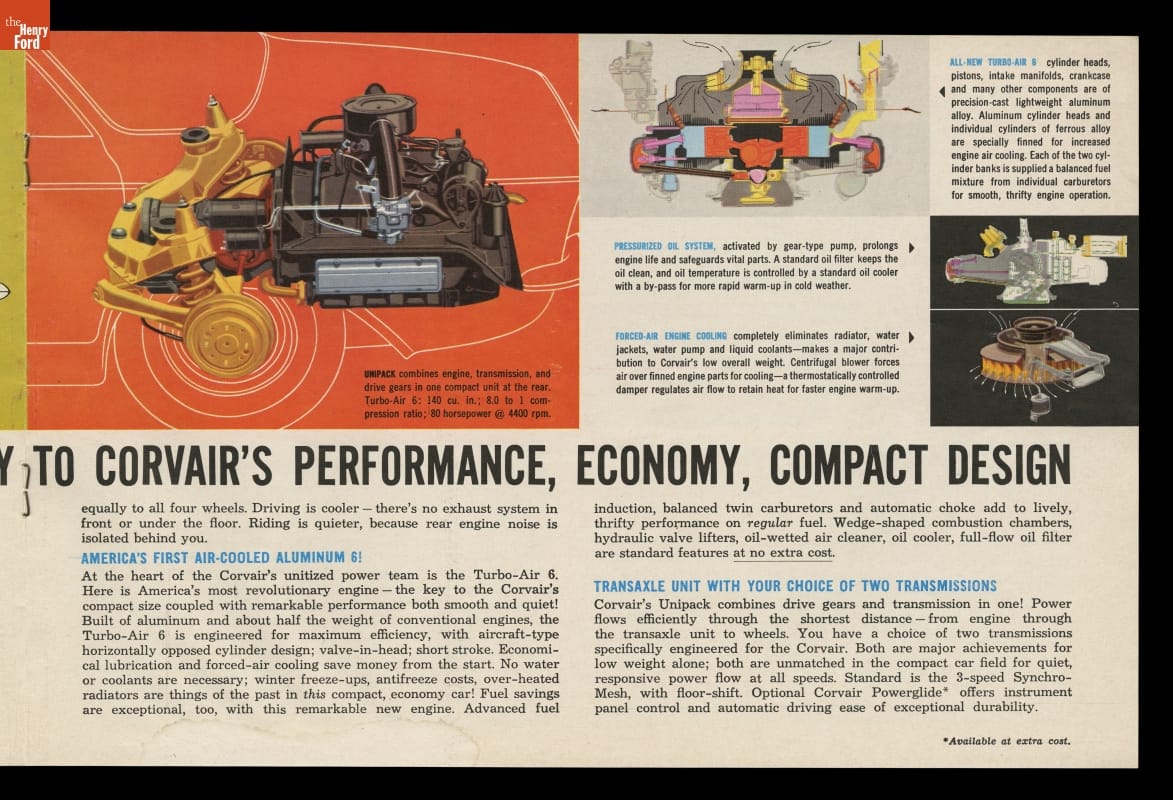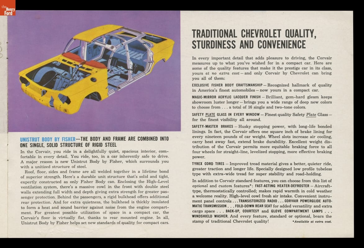 A dramatically styled compact car with a rear-mounted engine, the 1960 Chevrolet Corvair was something different from Detroit's Big Three automakers. This sales brochure shows the ins and outs of what General Motors called "The Prestige Car in its Class."