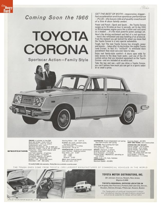 Toyota promoted its 1966 Corona as a family-sized sedan with sports car action in this sales brochure. The Corona's and other Toyota vehicles' performance and reliability continued to attract American buyers. By the mid-1970s, Toyota was the number one import brand in the United States.