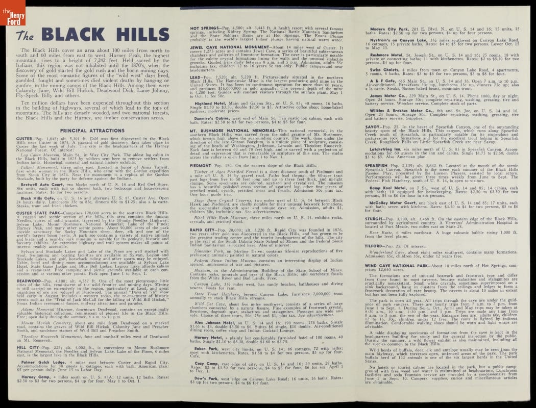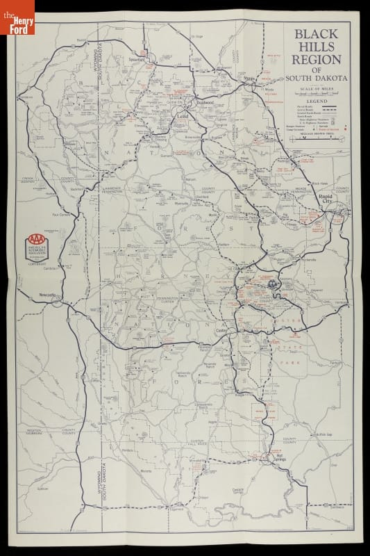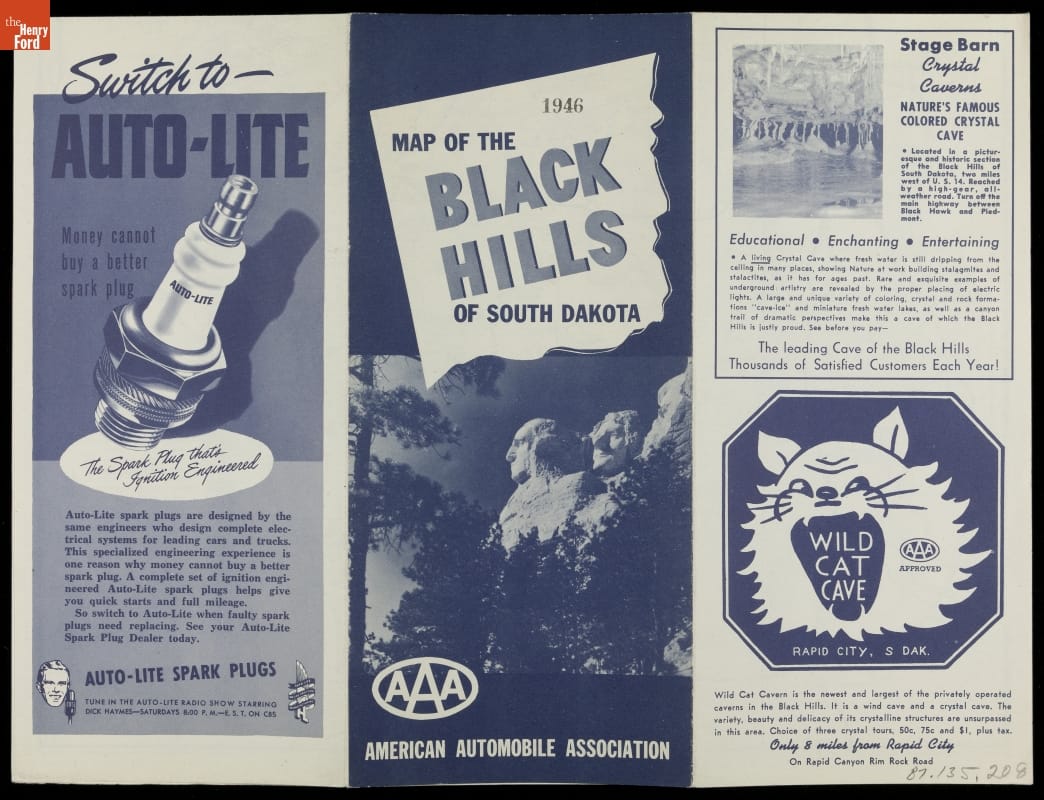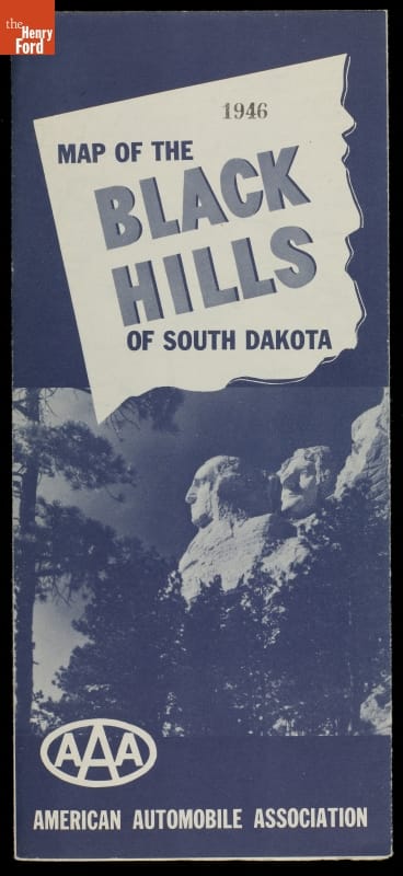 After the Second World War, many Americans took to the road to find rest and relaxation. Viewing brochures helped travelers decide where to go on vacation. This 1946 brochure and map produced by the American Automobile Association provided would-be vacationers with a variety of touring options around the Black Hills region of South Dakota.