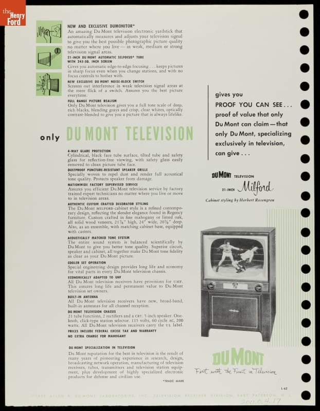 In the experimental days of television, Dr. Allen B. DuMont pioneered both television manufacture and broadcasting. DuMont Laboratories were responsible for many early technical innovations, including the first consumer-oriented electronic television set in 1938. This is a two-sided advertisement for a 1952 21-inch DuMont television set.