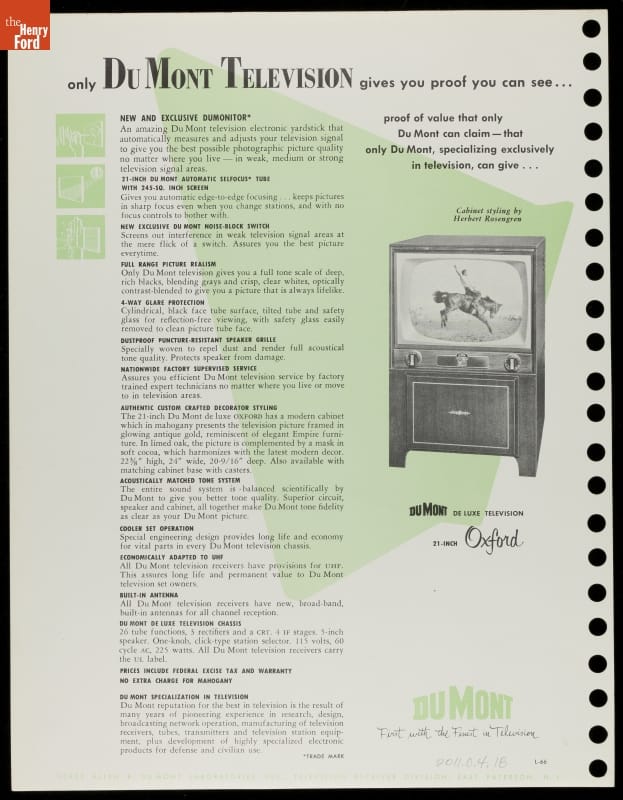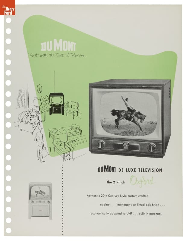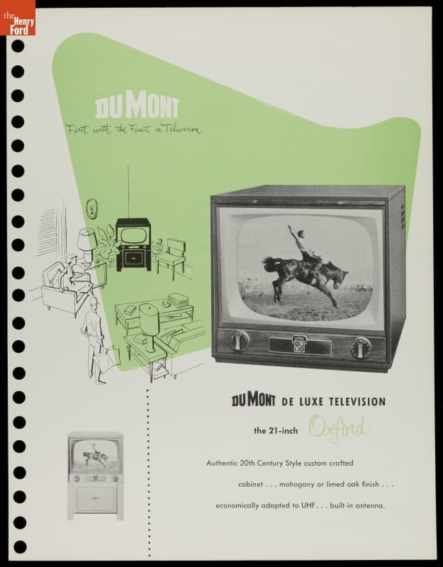 DUMONT DE LUXE TELEVISION / the 21-inch Oxford/ Authentic 20th Century Style custom crafted / cabinet...mahogany or limed oak finish... / economically adapted to UHF...built-in antenna.