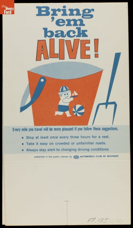 Printed on both sides: Bring / 'em / back / ALIVE! / Every mile you travel will be more pleasant if you follow these suggestions. / Stop at least once every three hours for a rest. / Take it easy on crowded or unfamiliar roads./ Always stay alert to changing driving conditions. Printed at bottom each side: presented in the public interest by AAA AUTOMOBILE CLUB OF MICHIGAN