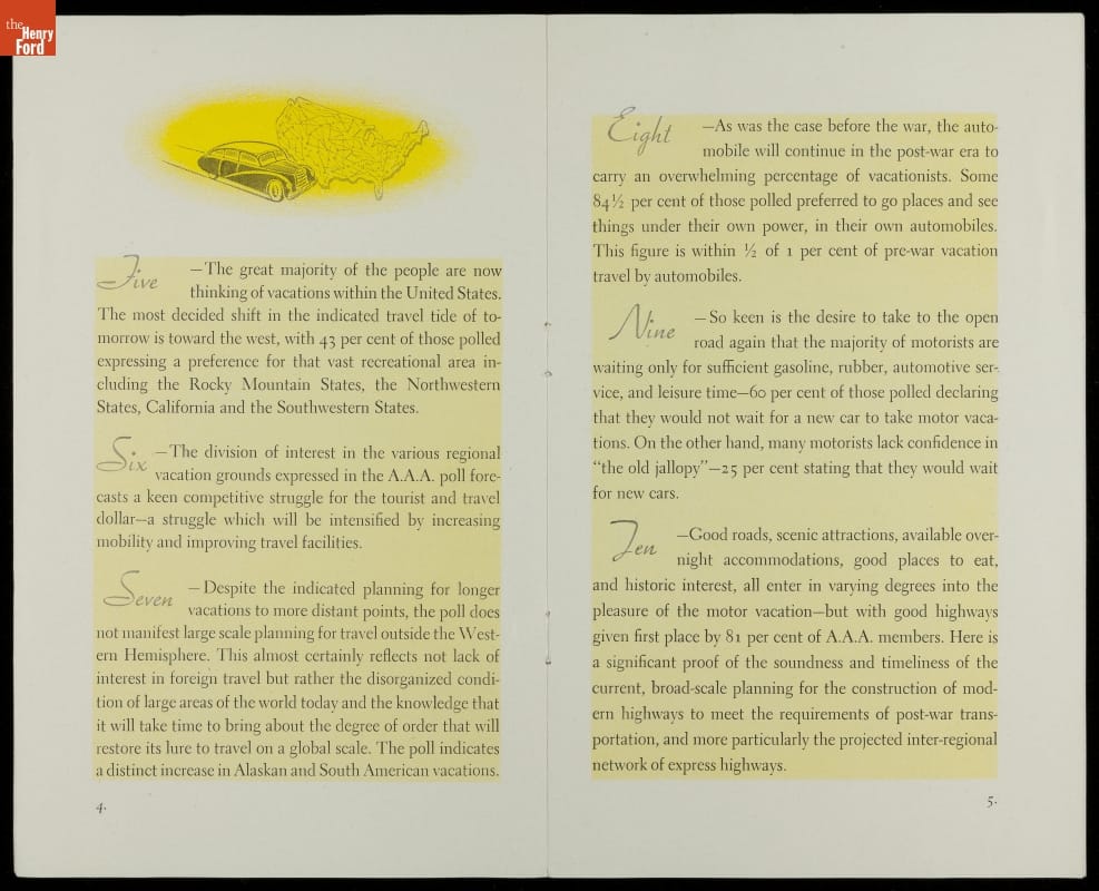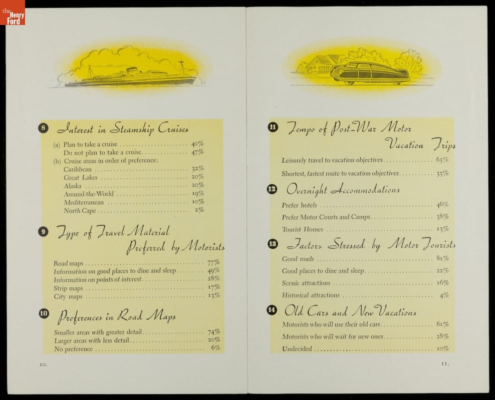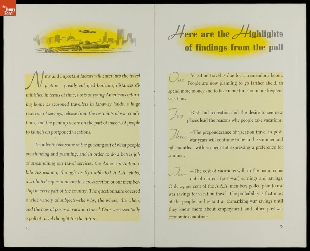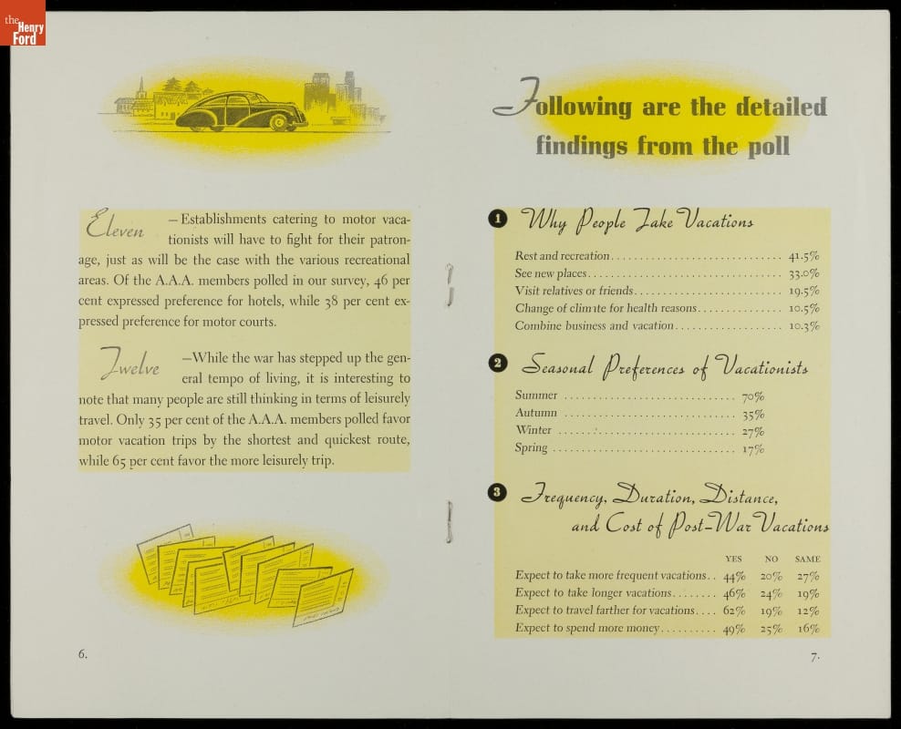 A poll in this American Automobile Association booklet reveals that 41.5 percent of Americans took vacations for rest and recreation in the postwar era, 33 percent to see new places, 19.5 percent to visit relatives or friends, and 10.5 percent for health reasons.