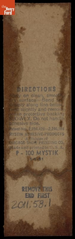 On back of sticker: (instructions for use) / Mystik Adhesive Products a Division of Chicago Show Printing Co. / Made and Printed in USA. / P100 MYSTIK / 1-1-51