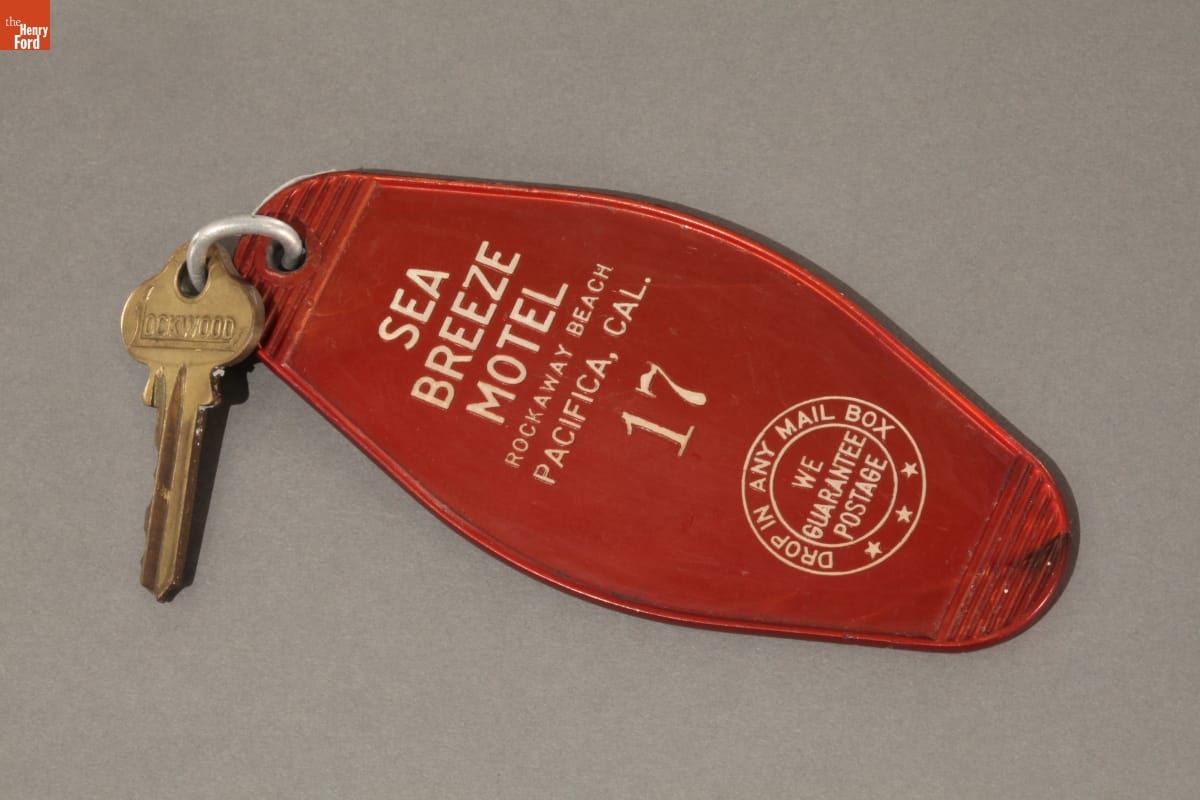Weary mid-20th century travelers received keys to their rooms after they checked in. These keys, usually with an overly large fob, could be dropped in a mailbox and returned if accidently carried off. Today, many motels use electronic key cards to let customers access their rooms.