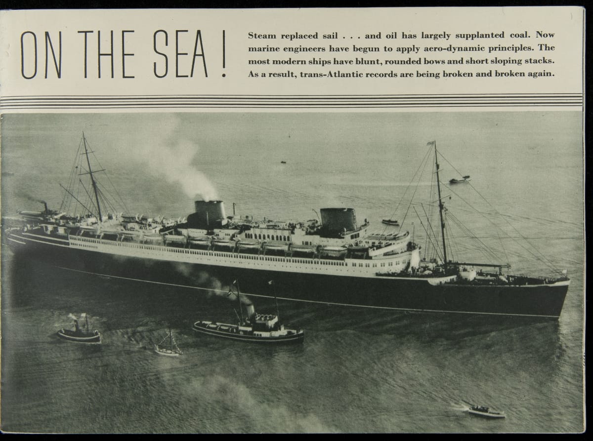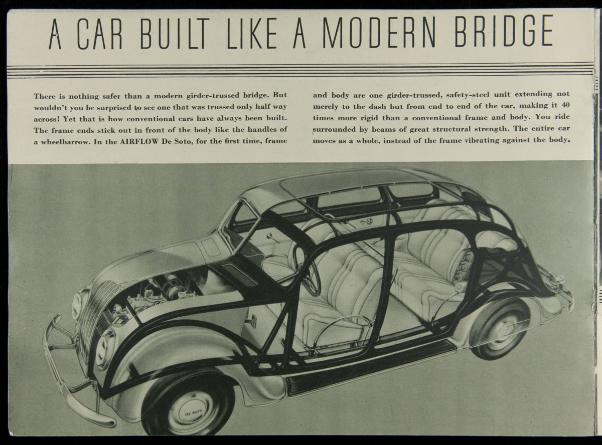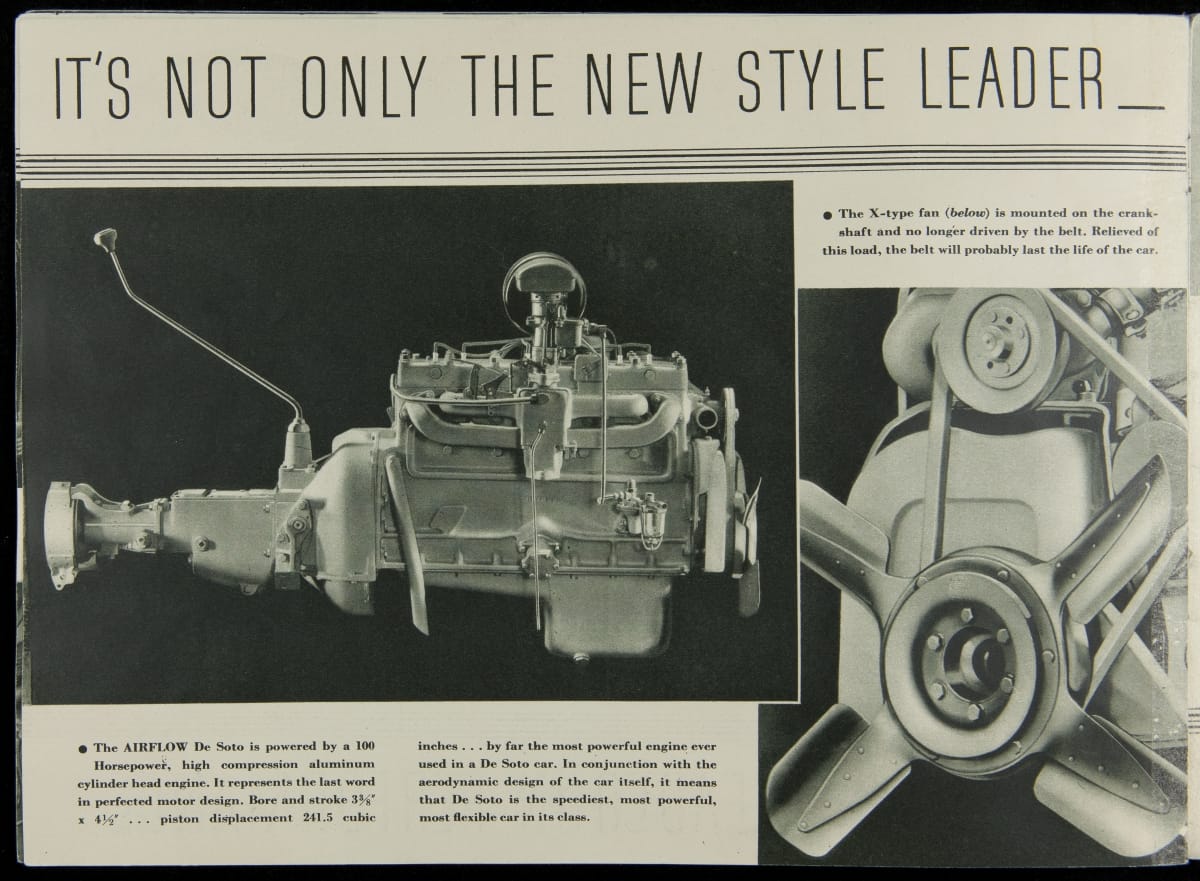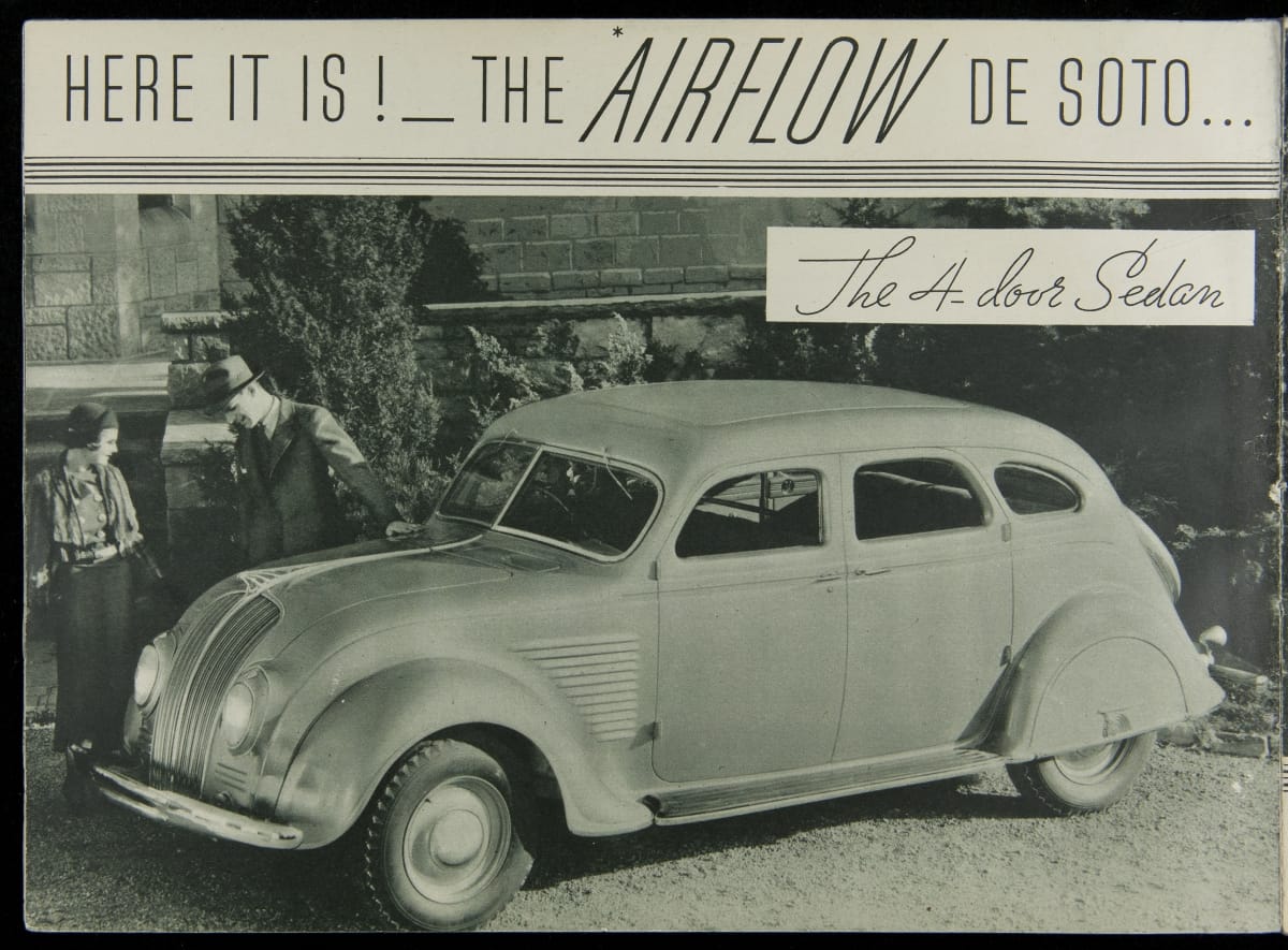Chrysler introduced the Airflow, sold under the Chrysler and DeSoto makes, for 1934. The car's streamlined appearance was in keeping with styling trends in airplanes, trains, and ships -- a point made clear by the cover of this sales brochure. But the Airflow's look was too unconventional for customers. Chrysler canceled DeSoto's version after three years of disappointing sales.