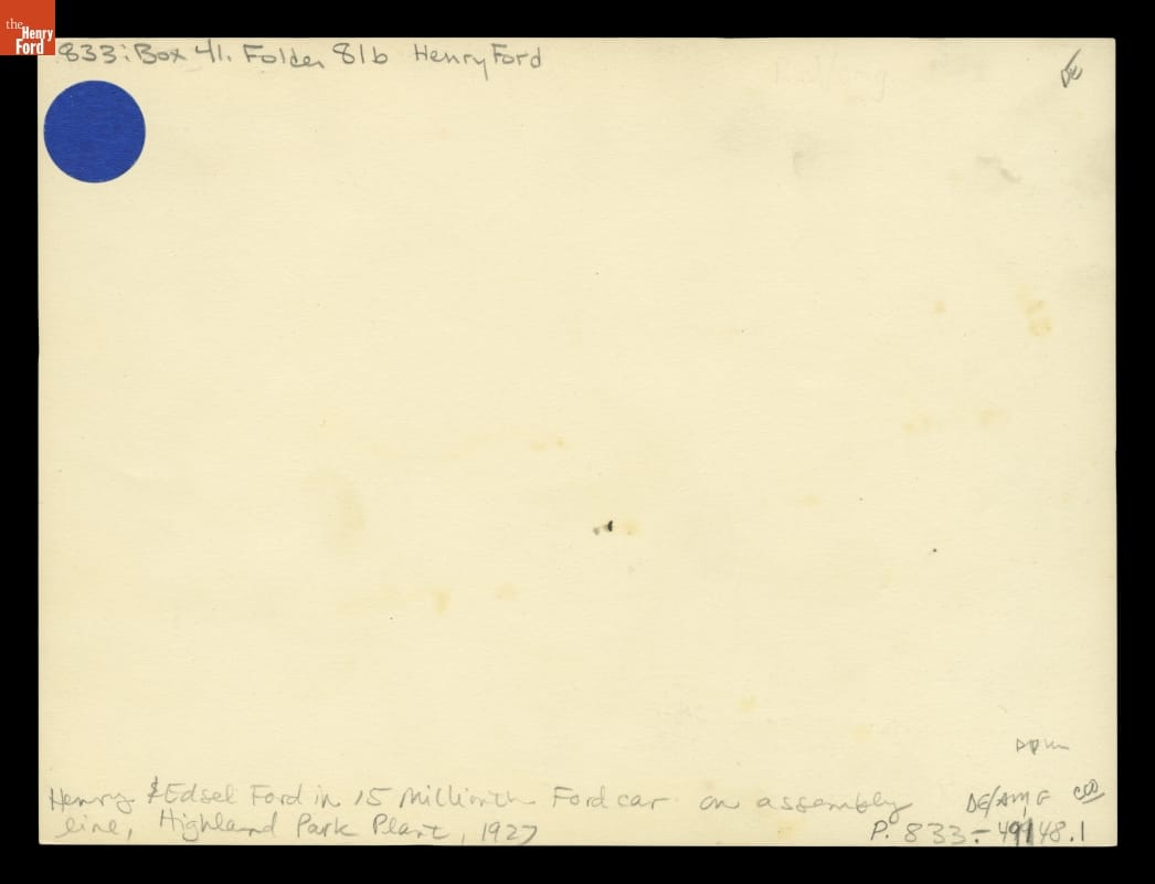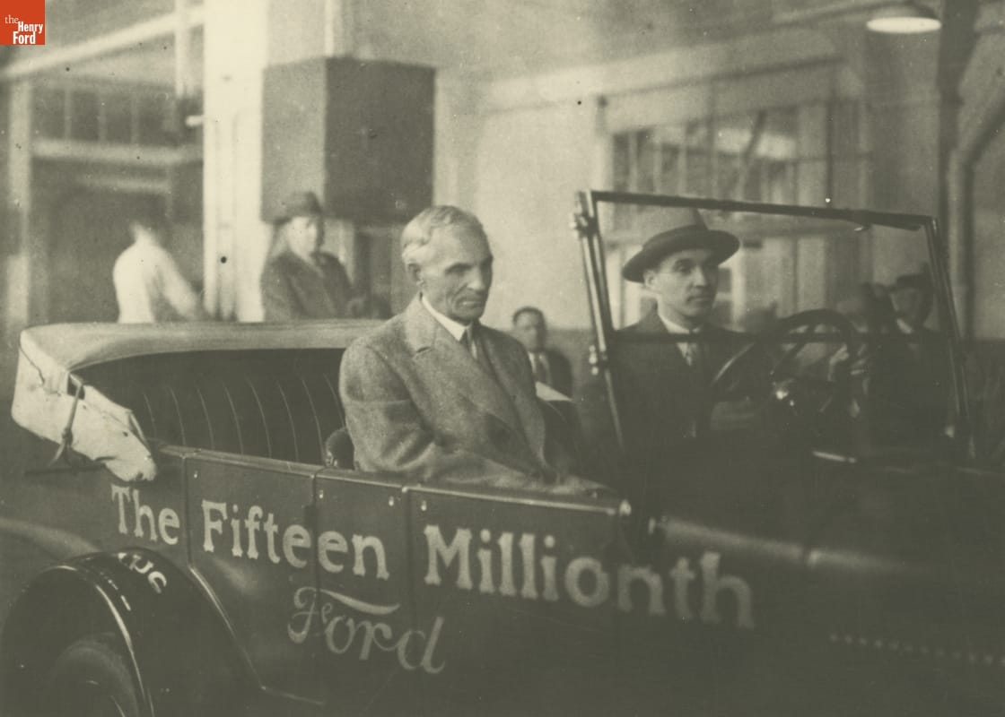 Henry Ford and Edsel Ford in the Fifteen Millionth Ford Car at the Highland Park Plant, 1927