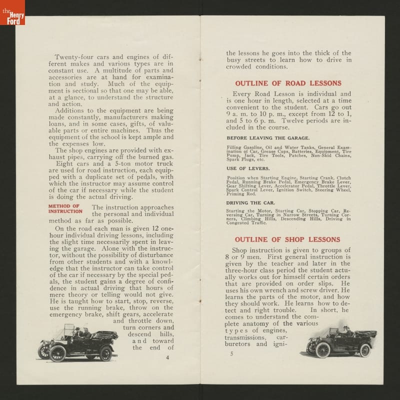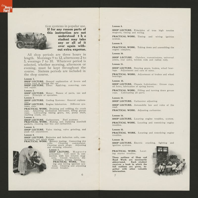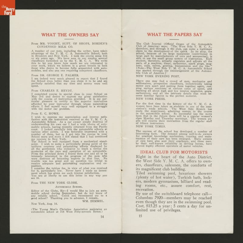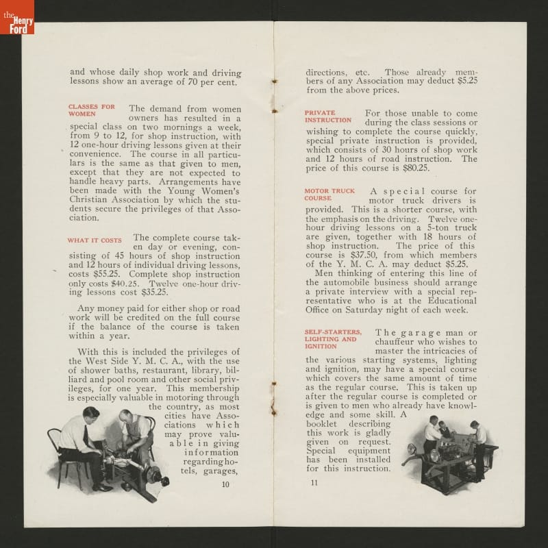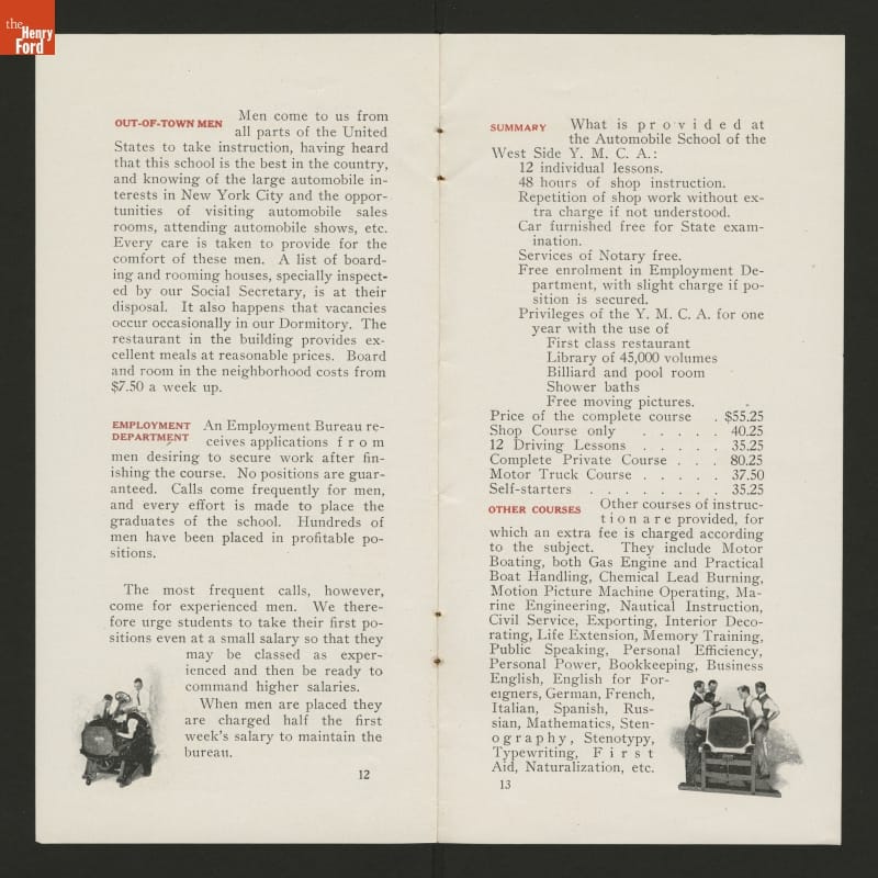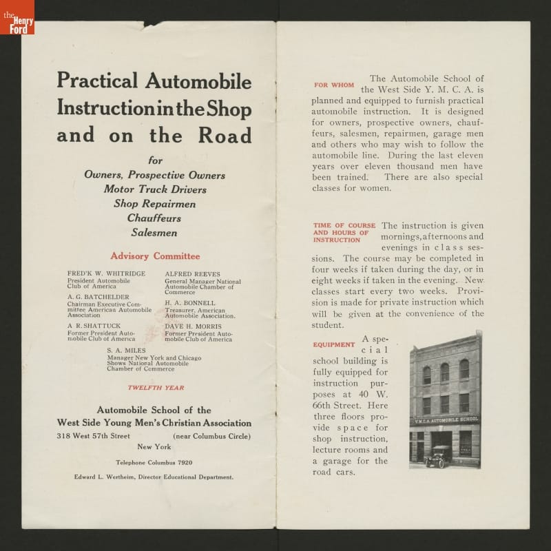 The West Side YMCA in New York City provided practical automobile instruction for owners, chauffeurs, salesmen, and shop repairmen. This brochure outlines the information prospective students would receive during lessons.