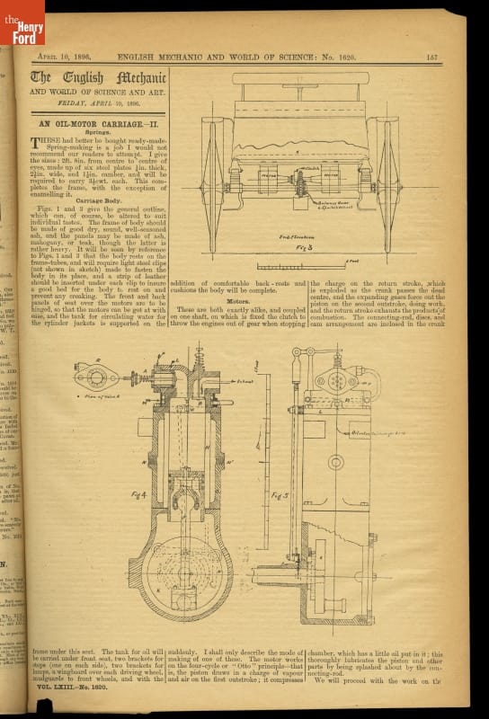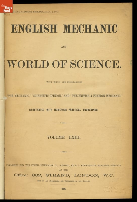 Inventors shared their information through technical publications. This 1896 issue of The English Mechanic provided articles and "numerous practical engravings" for others throughout the world. One article in this issue helps readers create an oil-motor carriage.