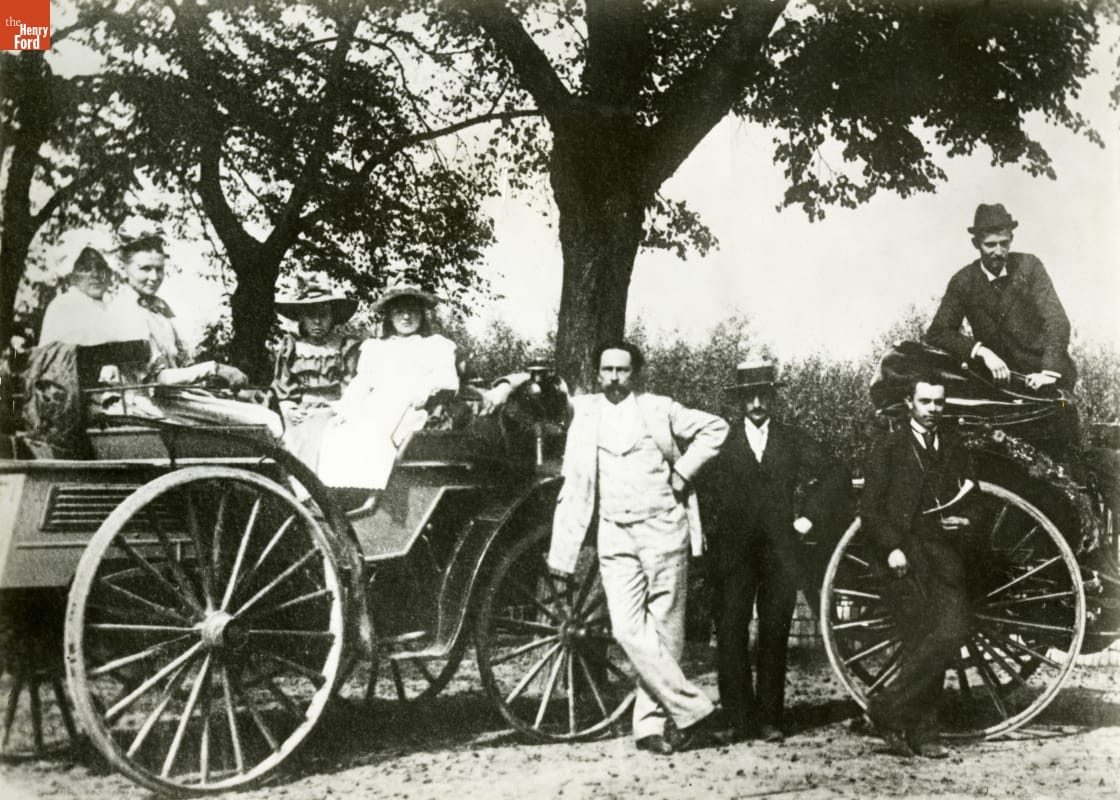 Karl Benz, the inventor of the modern automobile (in light-colored suit, center), posed with family members in front of Benz automobiles for this circa 1896 photograph.