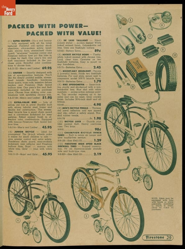 You could buy more than tires and automotive supplies from Firestone in the 1950s. This 1951 catalog contains a range of merchandise. Inside parents could find appliances and other household goods. Children could page through the toy section -- creating a Christmas wish list -- or imagine themselves riding a stylish new bike.