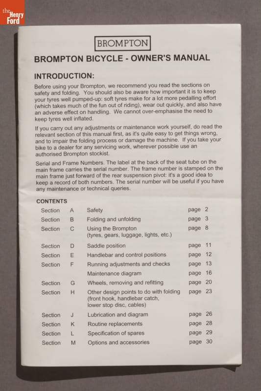 Manufactured in the United Kingdom, Brompton bicycles were designed for urban cyclists and commuters. The bikes could be folded into a more compact shape that was easier to carry on the subway or store under a desk at work. This owner's manual includes directions for folding and unfolding the bike, as well as instructions for its care and maintenance.