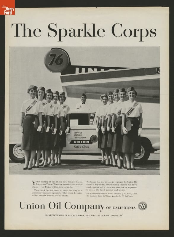 Gas stations were one of the few places drivers could stop to use the restroom. But station bathrooms developed a reputation for being dirty. Starting in the 1930s, some oil companies dispatched restroom inspectors. This 1959 advertisement shows the Union Oil Company's Sparkle Corps ready to check for cleanliness and safety.