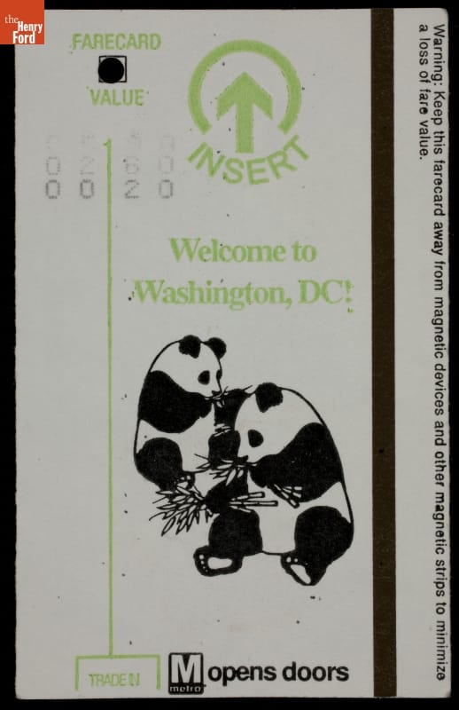This ticket gave passengers access to Washington, D.C., metro area subway lines, known as the "Metro." Paper farecards with a magnetic stripe can hold a flexible amount of value -- appropriate for Washington's Metro system, which charges fares based on distance traveled.