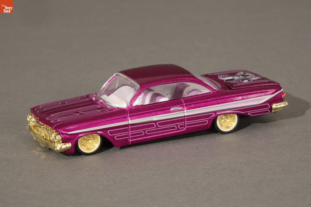 Lowriders transformed older-model, family-size cars into stylish rides with street-scraping suspensions and ornamental paint jobs. Customizers prefer American automobiles -- especially Chevys. Revell Inc., a die-cast and model toy company, created this 1:64 scale model of a 1961 Chevy Impala lowrider that has adjustable suspension.