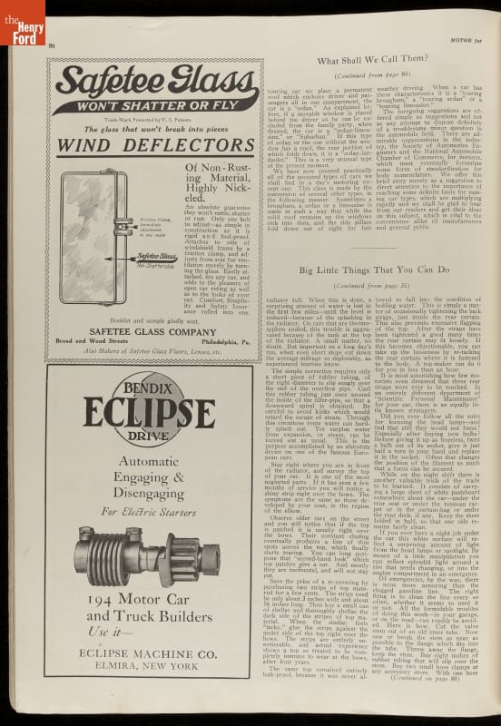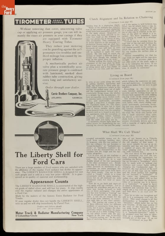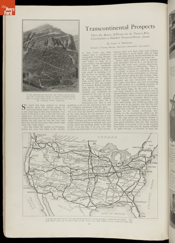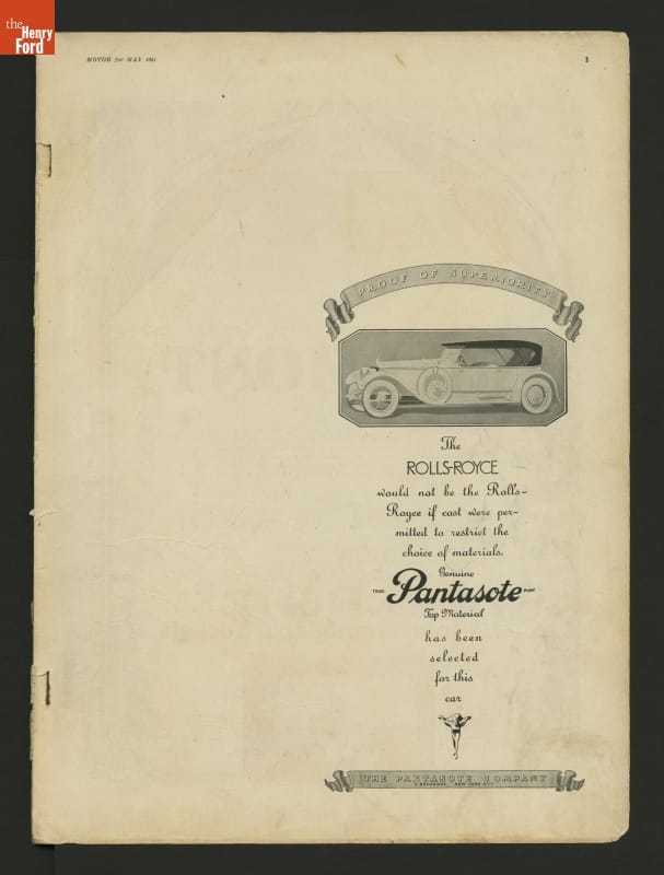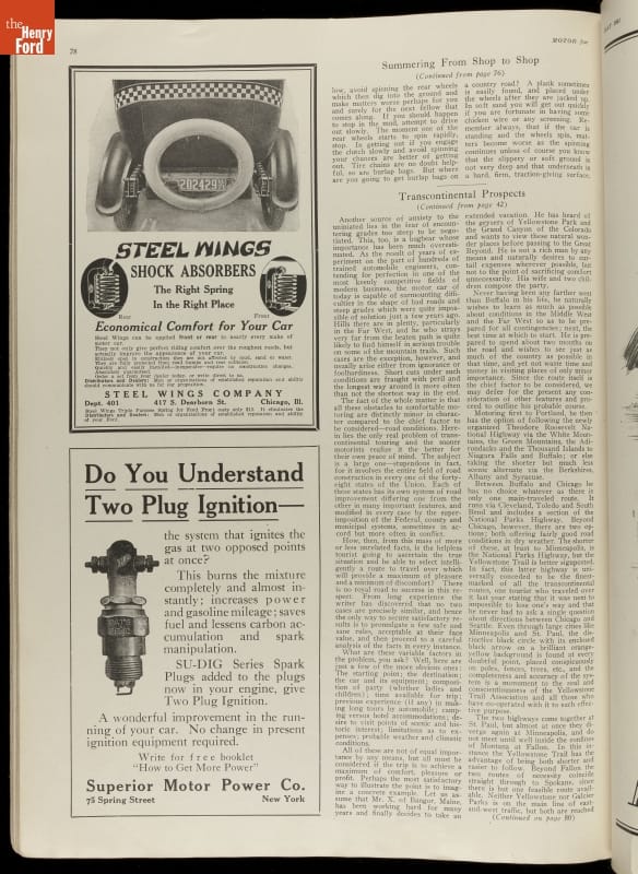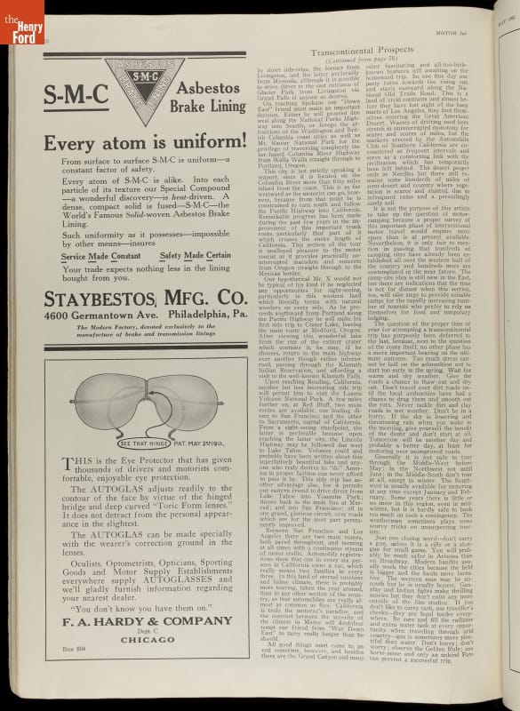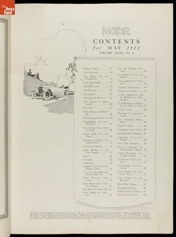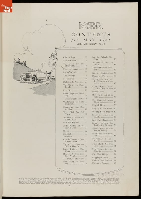 Early motorist magazines provided much needed information to drivers. This 1921 issue of Motor contained advertisements, photographs, and a variety of articles on travel, auto problem and repair, and other helpful hints.