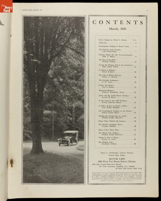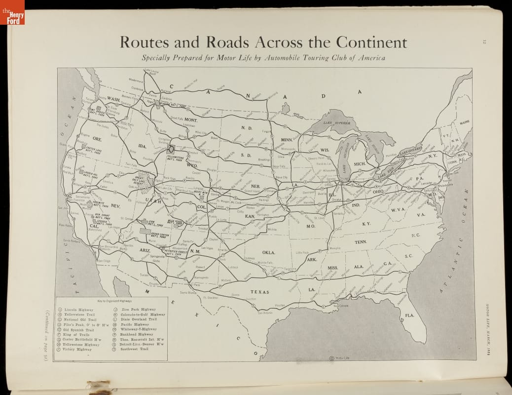 The growth of automobile ownership and development of good roads drove more Americans to explore the country in the 1920s. Motor Life offered a number of interesting articles for the motor tourists. Readers of this issue could learn about traveling across the country, as well as view a map of available transcontinental routes.