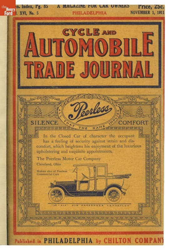 Early automotive periodicals, like this November 1911 issue of Cycle and Automobile Trade Journal, kept car owners up-to-date with new trends and inventions. Advertisers also publicized innovative products that helped motorists on their travels.