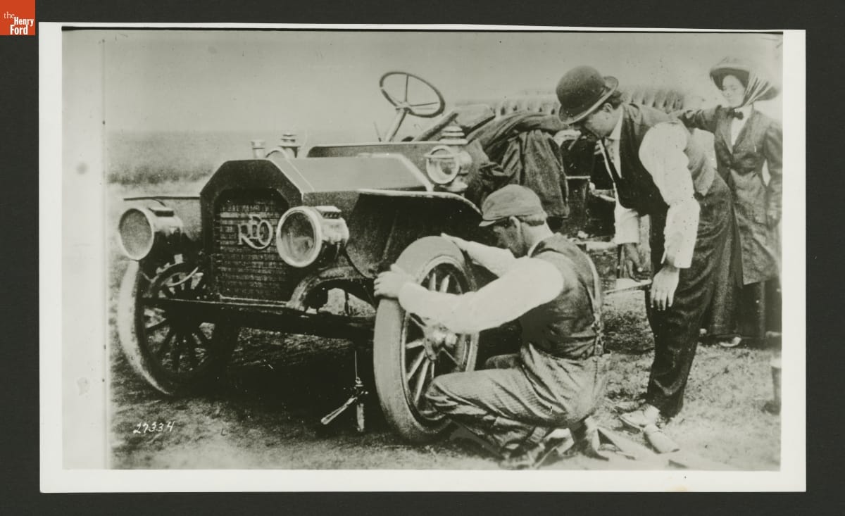 Numerous tire blowouts plagued motorists on the poor roads of the early 20th century. The man in this photograph is either removing a tire for repair or replacing an already repaired tire. The REO Motor Car Company was a Lansing, Michigan-based company that began producing cars in 1905.