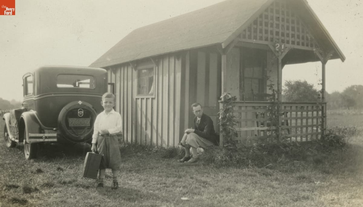 During the 1920s, owners of roadside autocamps discovered that many motorists would happily pay extra for privacy. Small tourist cabins and cottages promised quiet, privacy, and parking. And they cost less than a hotel. This photograph shows the Ebersole family unpacking for a nights stay at a tourist cabin in Saco, Maine, in 1929.