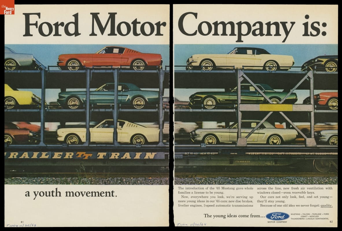 Printed above image: Ford Motor Company is: / a youth movement. / The introduction of the '65 Mustang gave whole / familes a license to to young. / Now everywhere you look, we're serving up / more young ideas in our '65 cars: new disc brakes, / livelier engines, 3-speed automatic transmissions / across the line, new fresh air ventilation with / windows closed-- even reversible keys./ Our cars not only look, feel and act young, / they'll stay young. / Because of one old idea we never forget: quality. / The young ideas come from / Ford Motor Company.