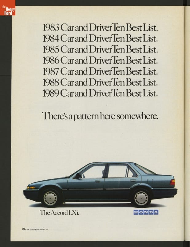 Car magazines in the United States examine the automobile industry, the vehicles, the people who drive them, and American car culture. Manufacturers also advertise their products in these pages. Honda promoted its Accord in this 1989 issue of Car and Driver, emphasizing the Accord's inclusion on Car and Driver's "Ten Best List" from 1983 to 1989.