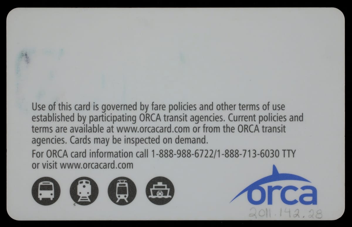 This transit fare card allowed a passenger to travel by bus, light rail, commuter rail, or car ferry in the Seattle area.