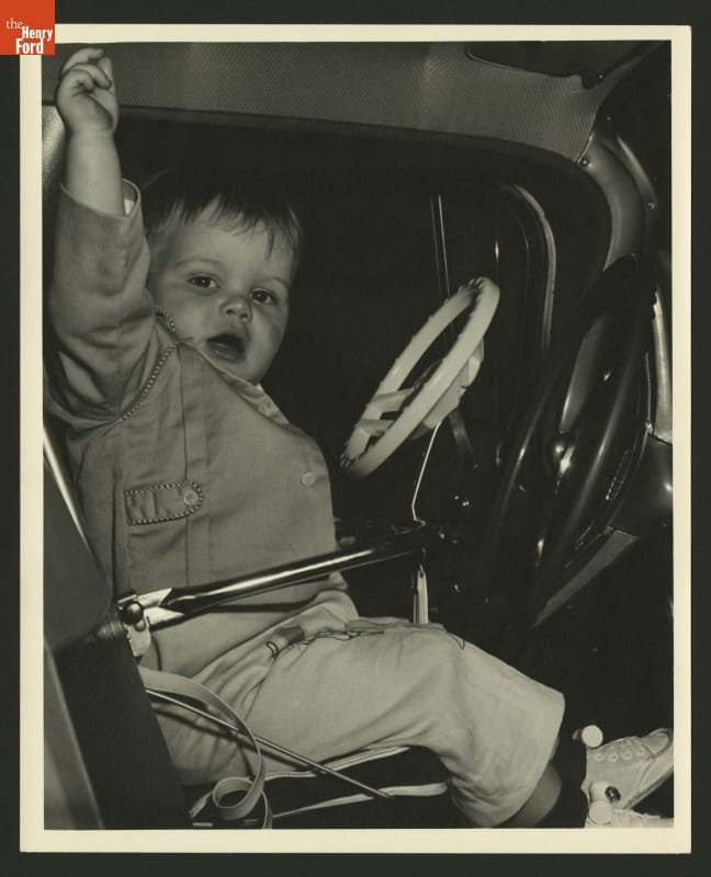 The child in this car seat has his own steering wheel to occupy his time while on the road. This unanchored car seat from the early 1960s, however, offered little protection in case of an accident.