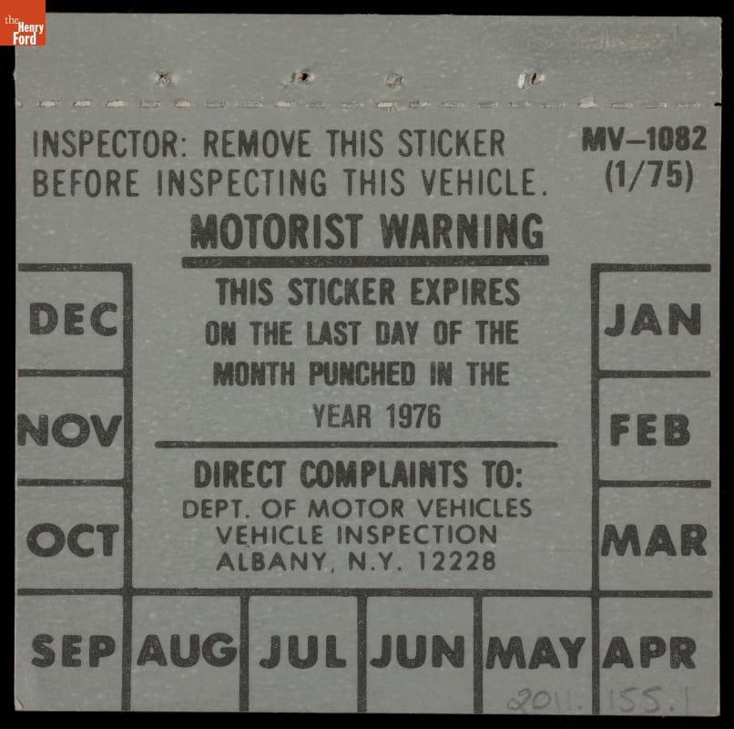 INSPECTOR: REMOVE THIS STICKER / BEFORE INSPECTING THIS VEHICLE / MV-1082 / (1/75) / MOTORIST WARNING / THIS STICKER EXPIRES / ON THE LAST DAY OF THE / MONTH PUNCHED IN THE / YEAR 1976 / DIRECT COMPLAINTS TO: / DEPT. OF MOTOR VEHICLES / VEHICLE INSPECTION / ALBANY, N.Y. 12228