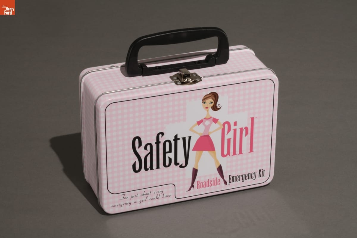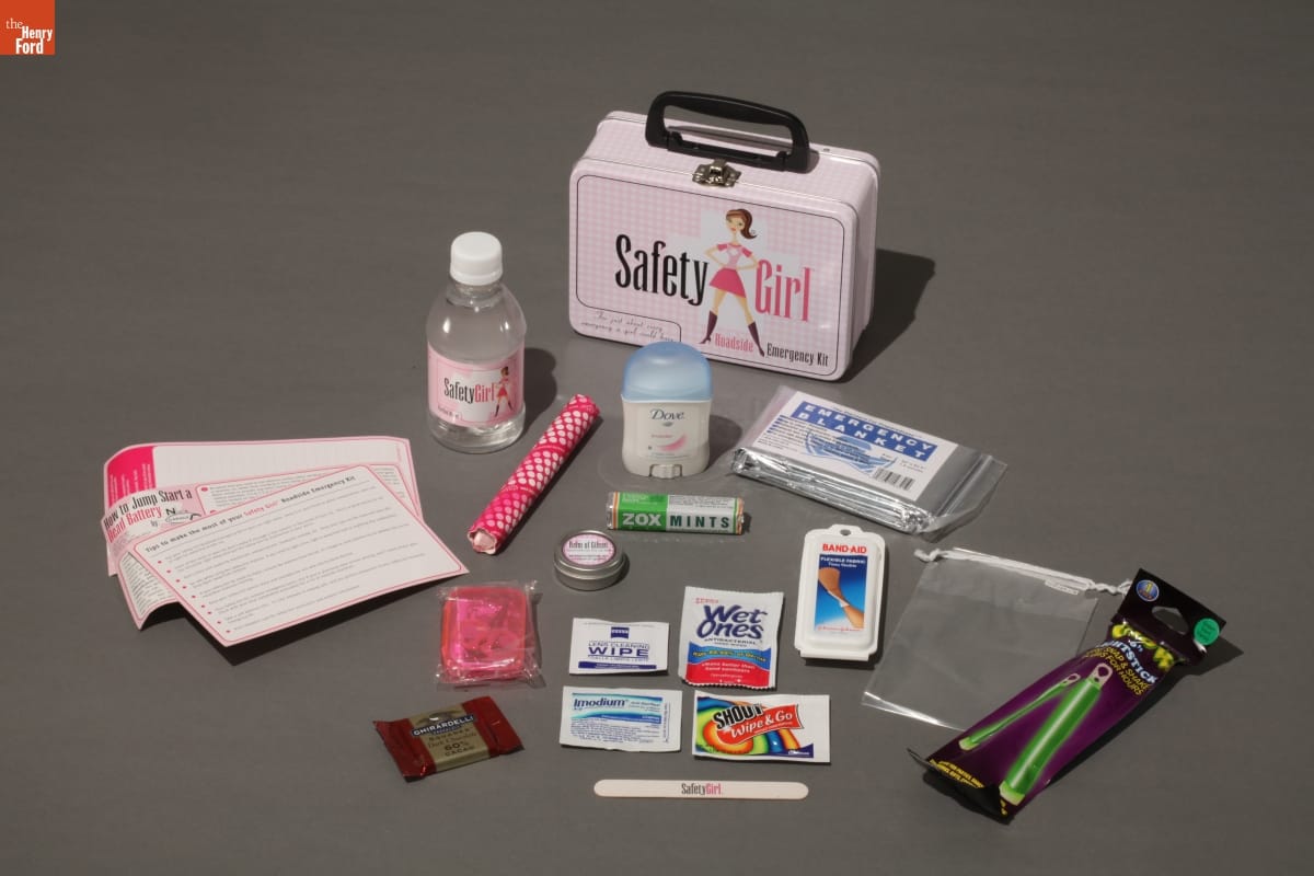 Printed on box lid: SAFETY GIRL / ROADSIDE EMERGENCY KIT / FOR JUST ABOUT EVERY EMERGENCY A GIRL COULD HAVE / FOR EMERGENCIES: SPACE BRAND EMERGENCY BLANKET / INSTRUCTIONS TO START A DEAD BATTERY / INSTRUCTIONS TO CHANGE A FLAT TIRE / GLOW STICK / 5 BANDAGES / 2 ANTISEPTIC WIPES / EMERGENCY CONTACT LIST / ACCIDENT RECORD / SAFETY GIRL PENCIL / PURIFIED WATER / AND FOR URGENCIES: / CHOCOLATE / ZOX BREATH FRESHENER / LIP MOISTURIZER / ANTI-PERSPIRANT / CLEANSING WIPES / PROFESSIONAL NAIL FILE / DITTIE TAMPONS / SEWING REPAIR KIT / INSTANT SPOT REMOVER WIPE / EYEGLASS LENS CLEANING TISSUE / AROMATHERAPY HEADACHE REMEDY