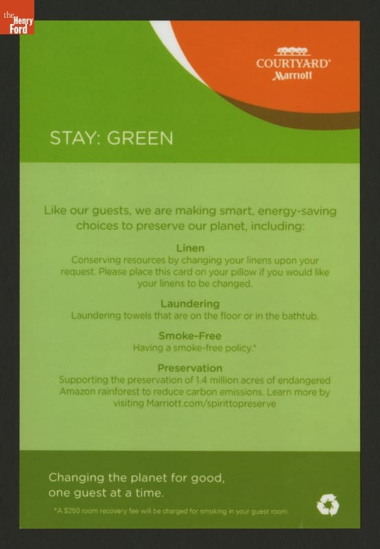 By the 2010s, many hotels moved beyond "clean and comfortable," appealing to travelers' environmental awareness. This 2011 "Stay: Green" card from Courtyard by Marriott provides guests with energy-saving tips.