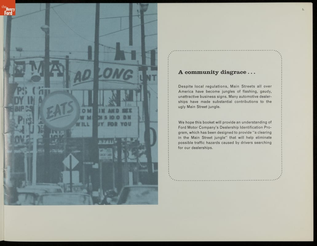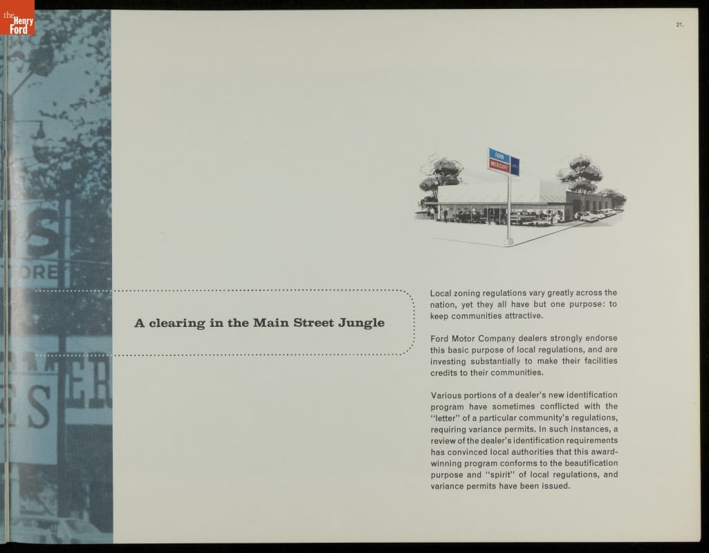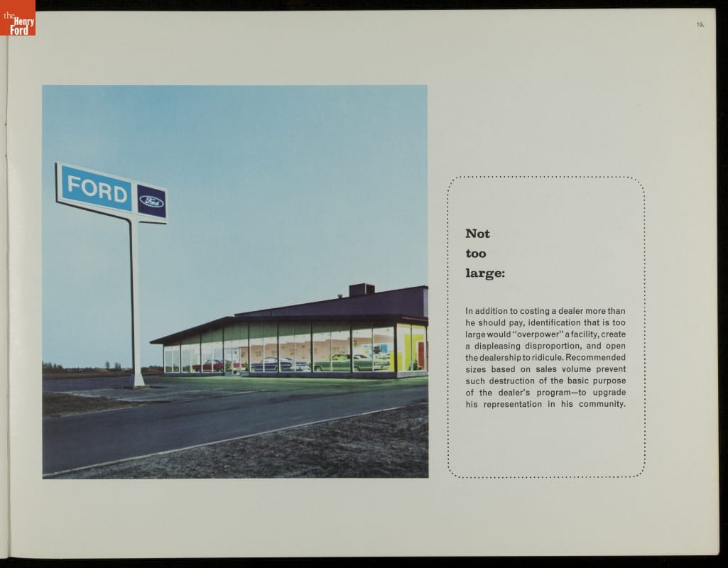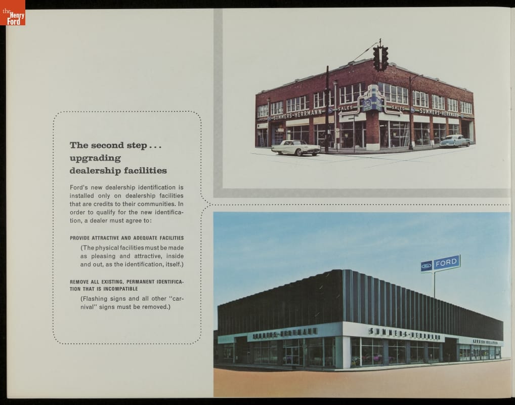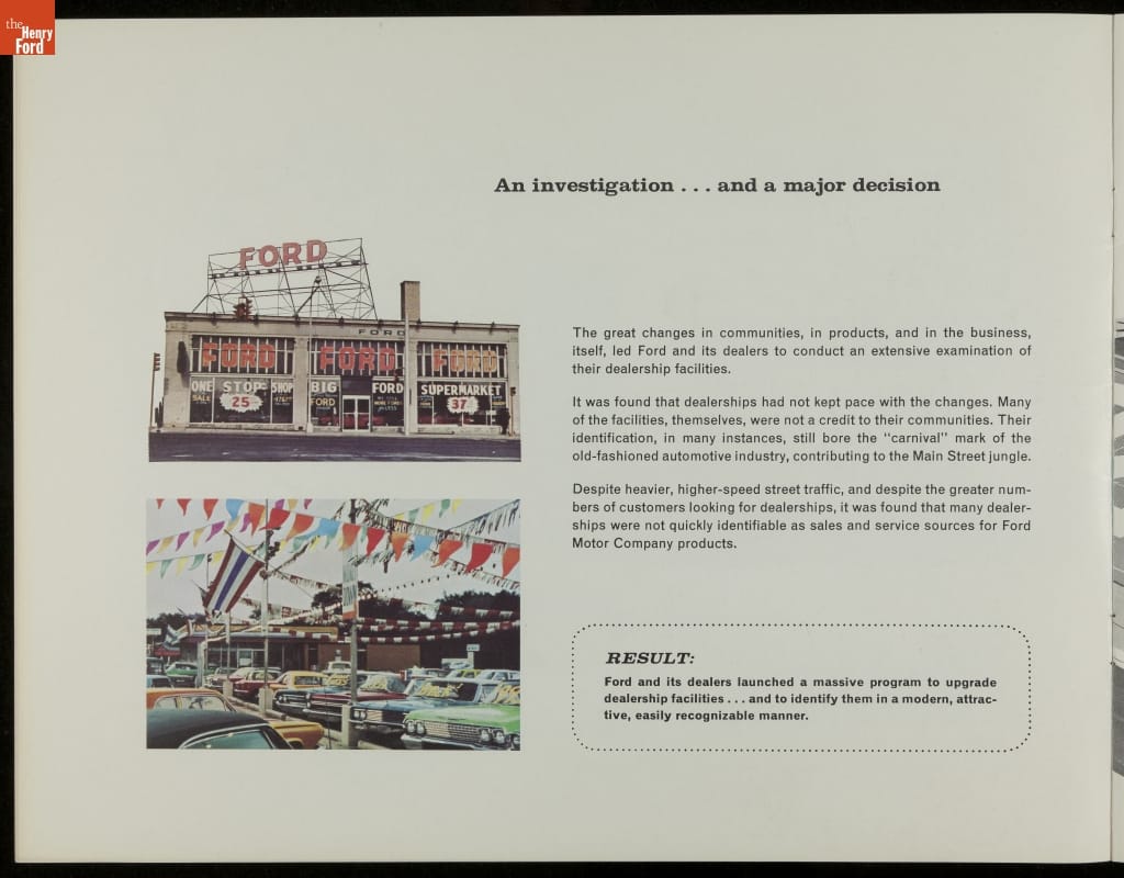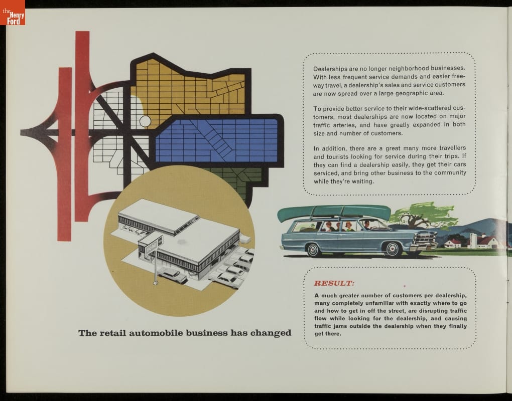 In the mid-1960s, Ford Motor Company took note of its out-of-date downtown dealerships, along with increased highway congestion and suburban sprawl. They replaced old dealerships with expansive modern ones along improved highways, making sure that their company logo was large and eye-catching as motorists passed by at high speeds. This booklet deemed the upgraded facilities attractive and easy to locate.