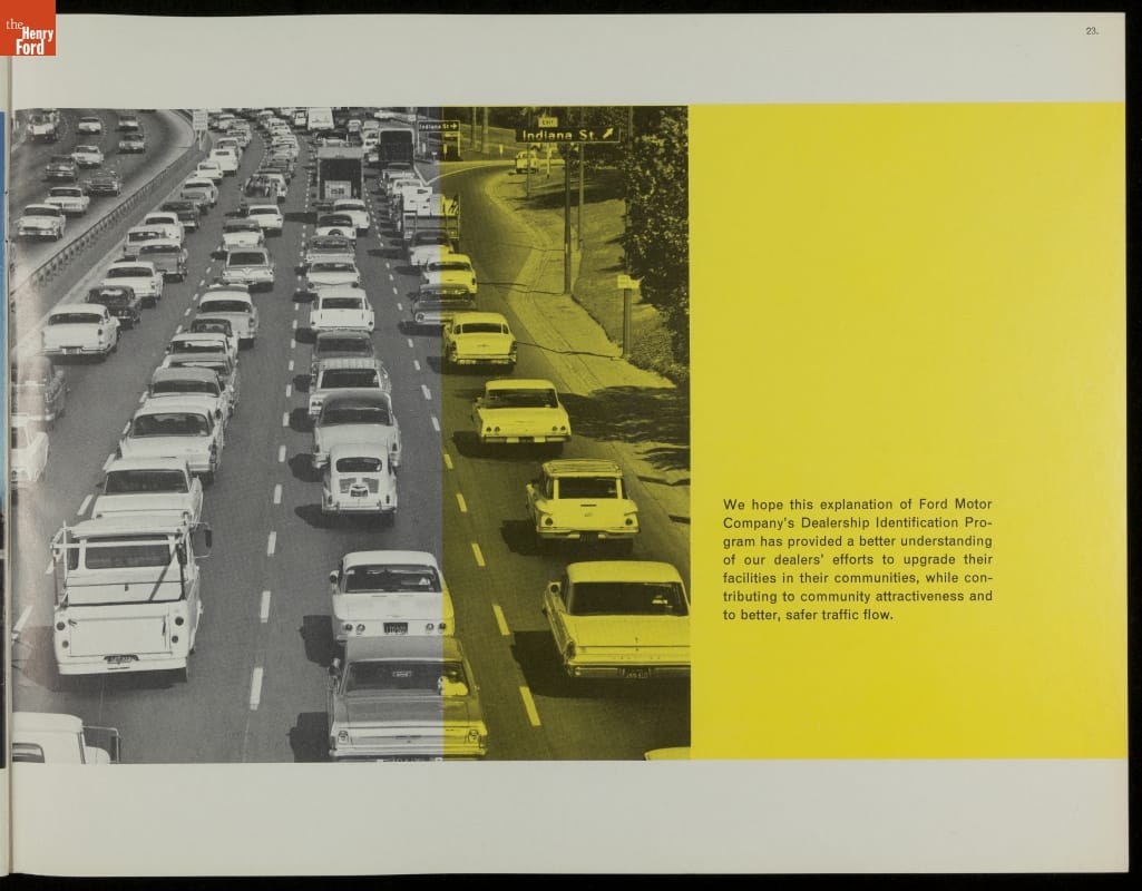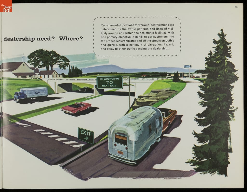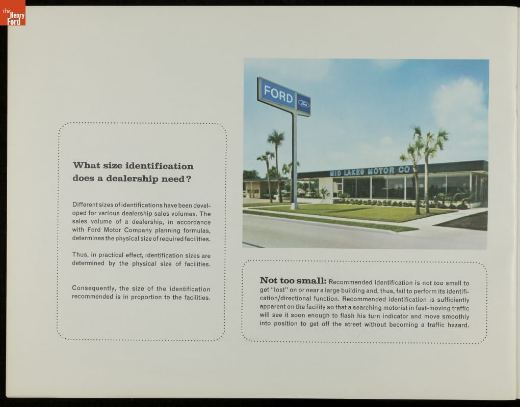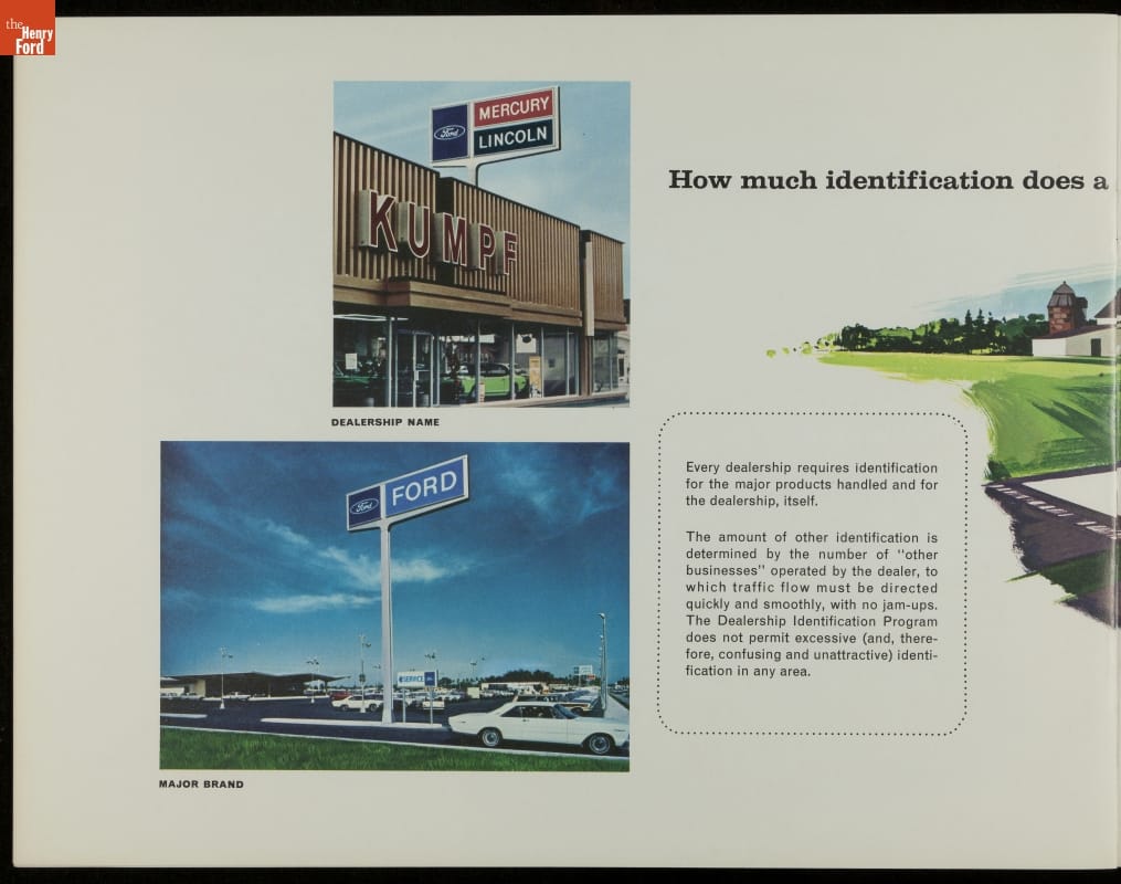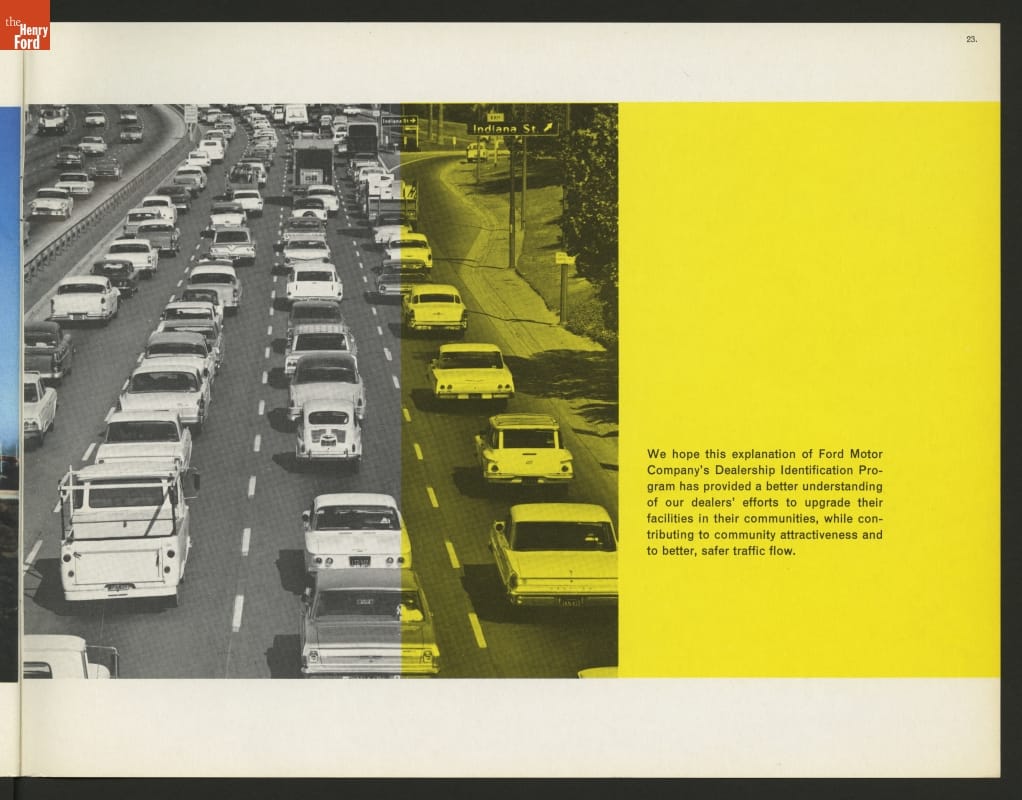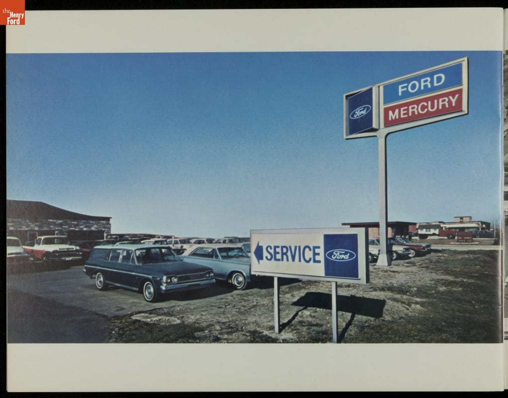 In the mid-1960s, Ford Motor Company took note of its out-of-date downtown dealerships, along with increased highway congestion and suburban sprawl. They replaced old dealerships with expansive modern ones along improved highways, making sure that their company logo was large and eye-catching as motorists passed by at high speeds. This booklet deemed the upgraded facilities attractive and easy to locate.