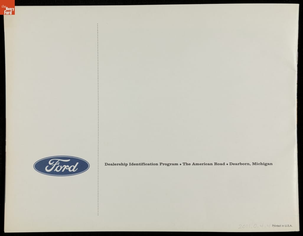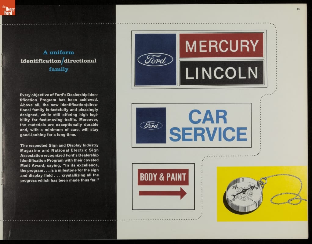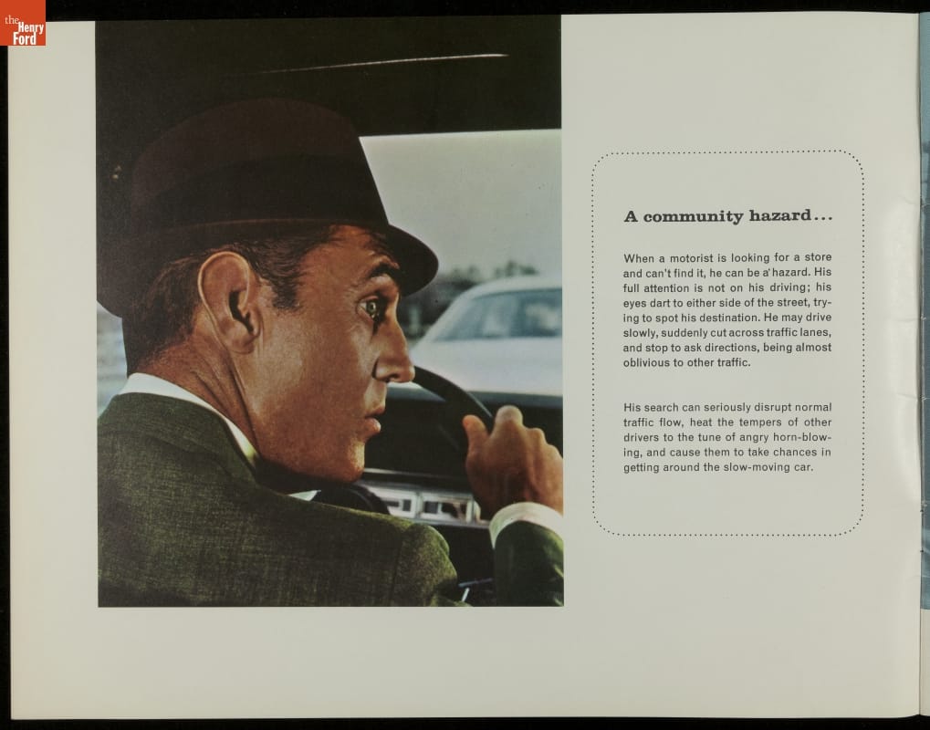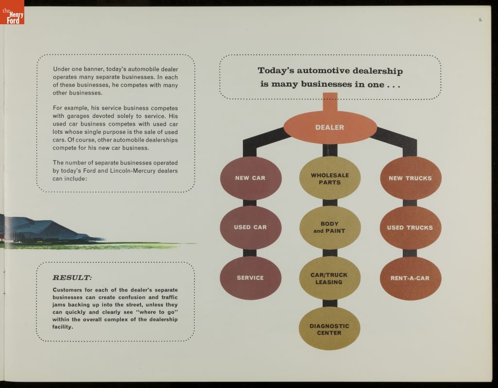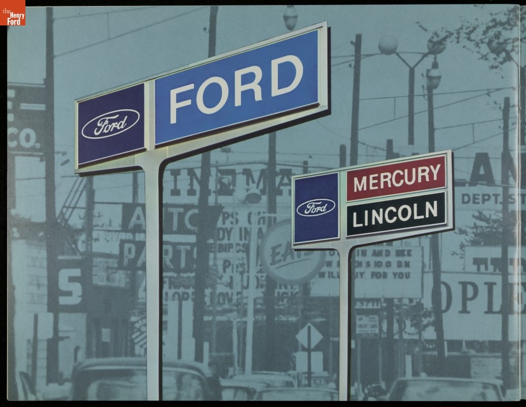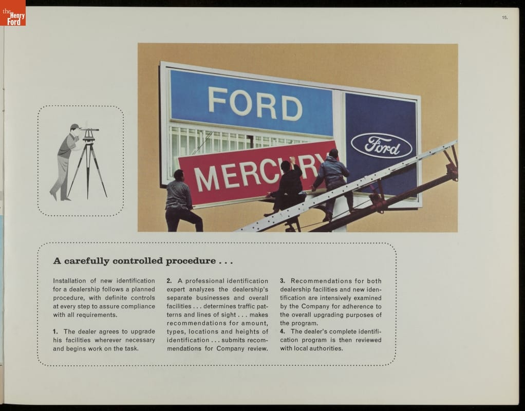 In the mid-1960s, Ford Motor Company took note of its out-of-date downtown dealerships, along with increased highway congestion and suburban sprawl. They replaced old dealerships with expansive modern ones along improved highways, making sure that their company logo was large and eye-catching as motorists passed by at high speeds. This booklet deemed the upgraded facilities attractive and easy to locate.