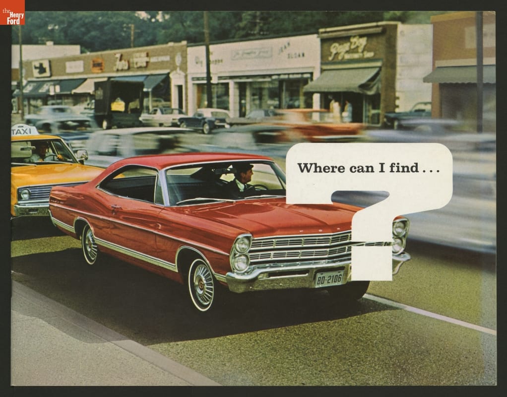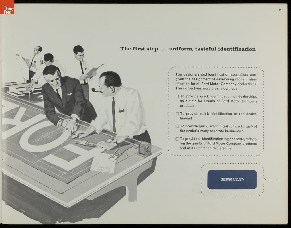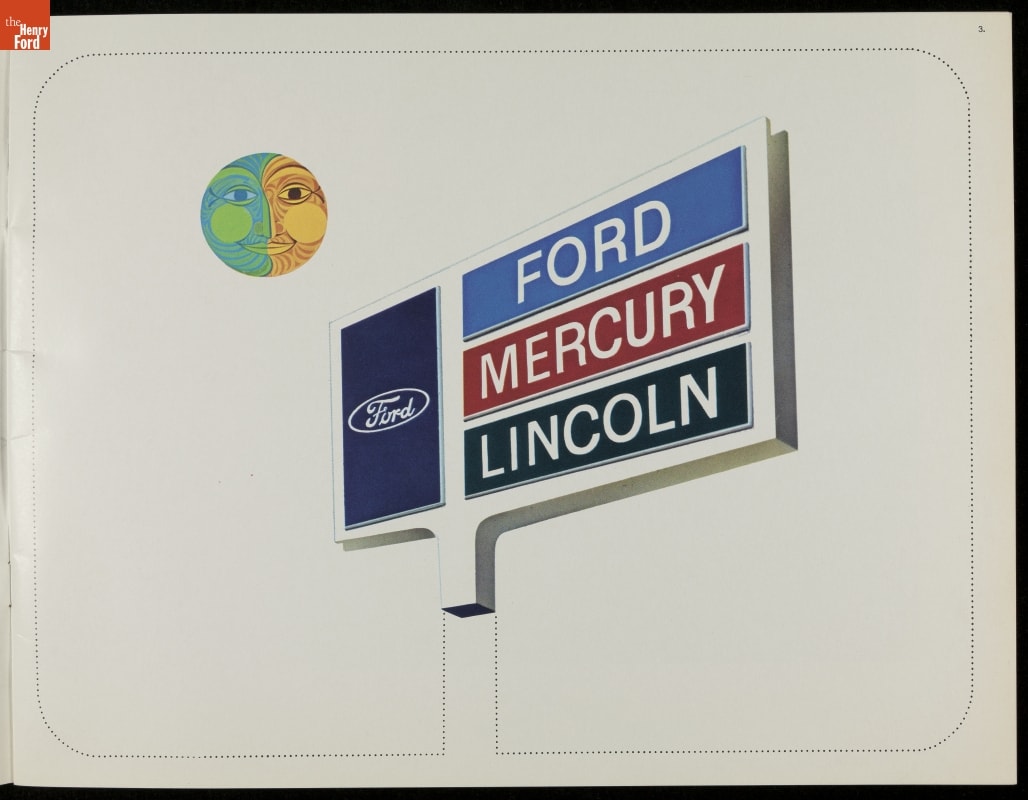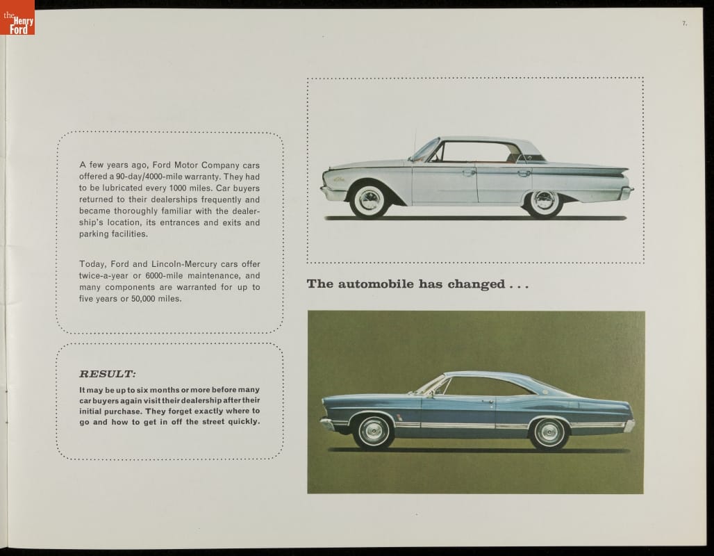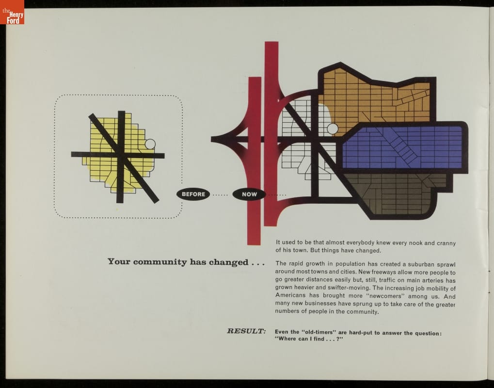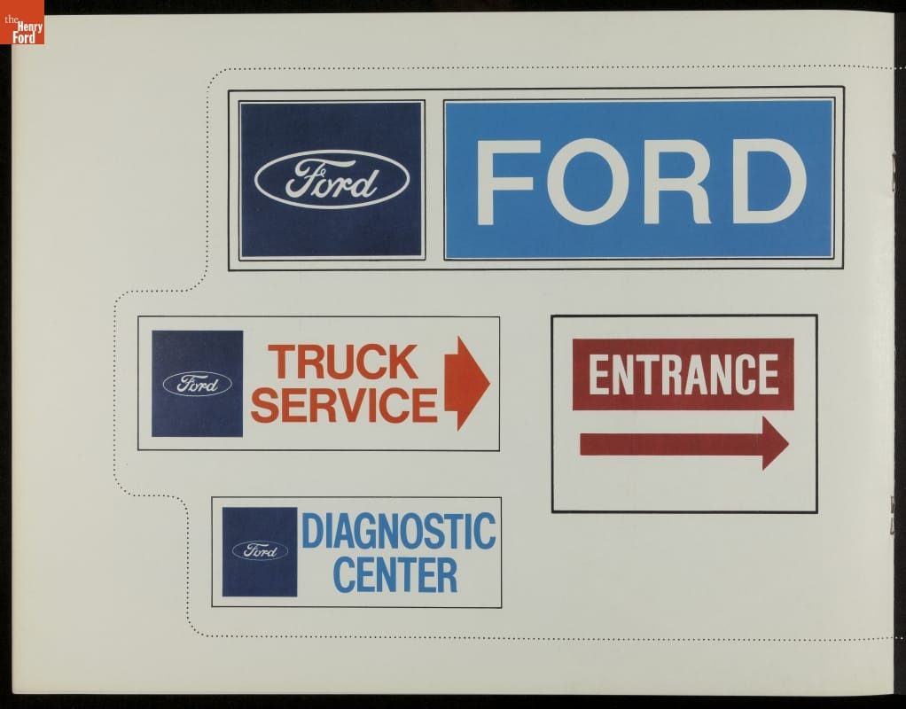In the mid-1960s, Ford Motor Company took note of its out-of-date downtown dealerships, along with increased highway congestion and suburban sprawl. They replaced old dealerships with expansive modern ones along improved highways, making sure that their company logo was large and eye-catching as motorists passed by at high speeds. This booklet deemed the upgraded facilities attractive and easy to locate.