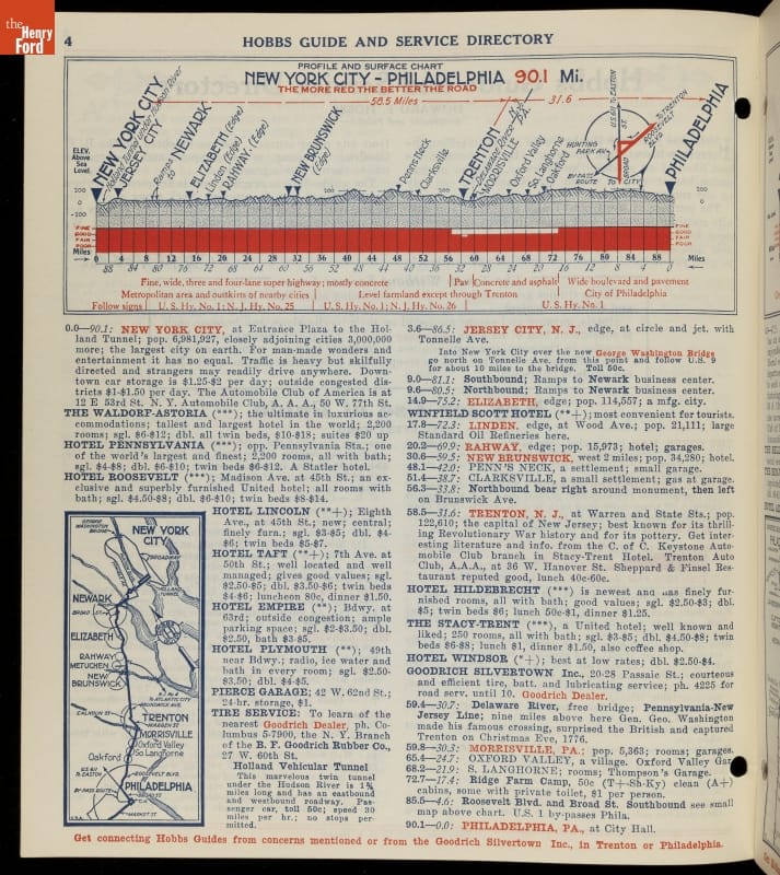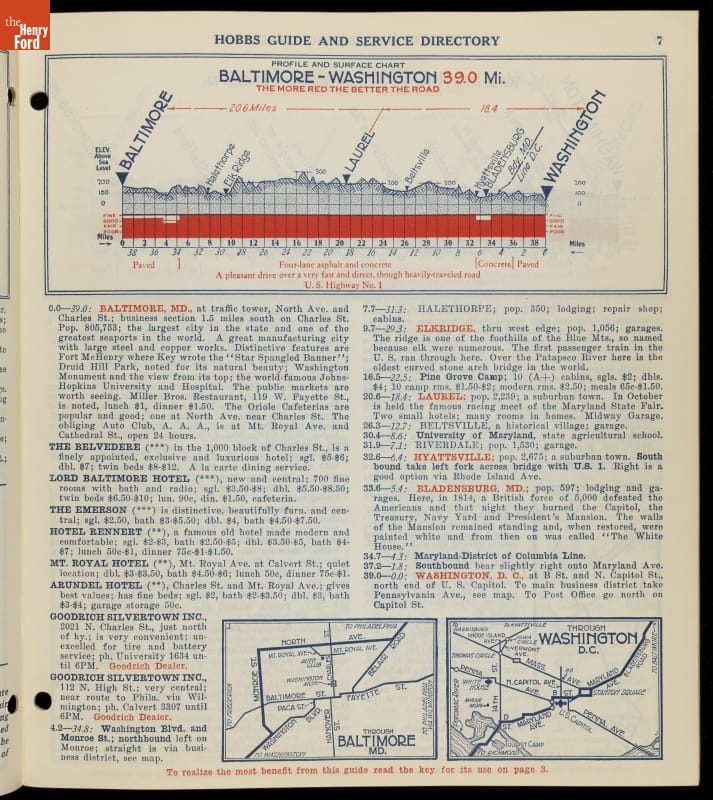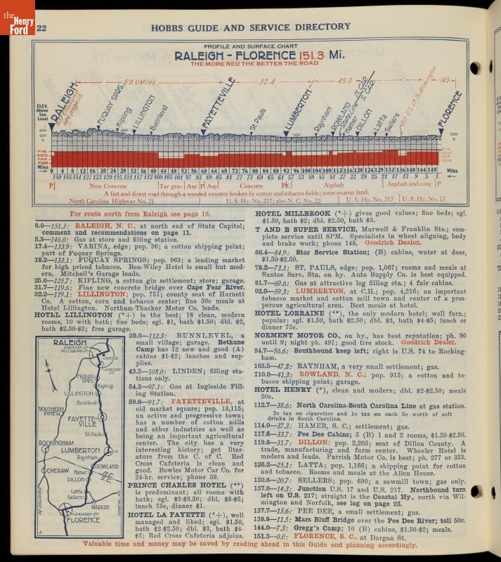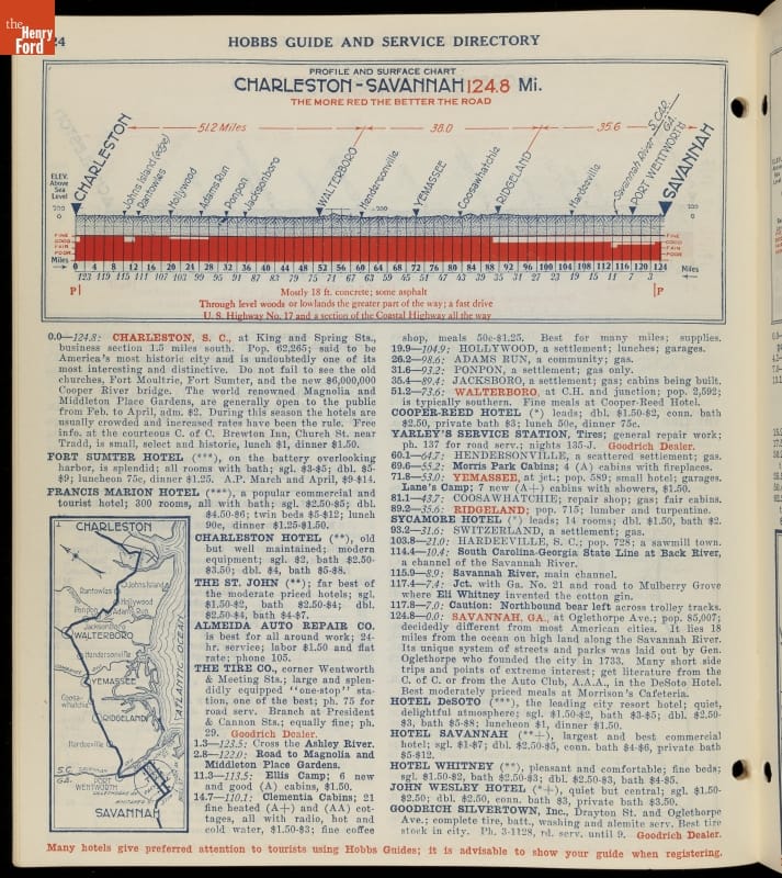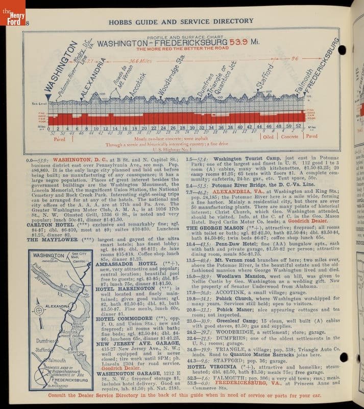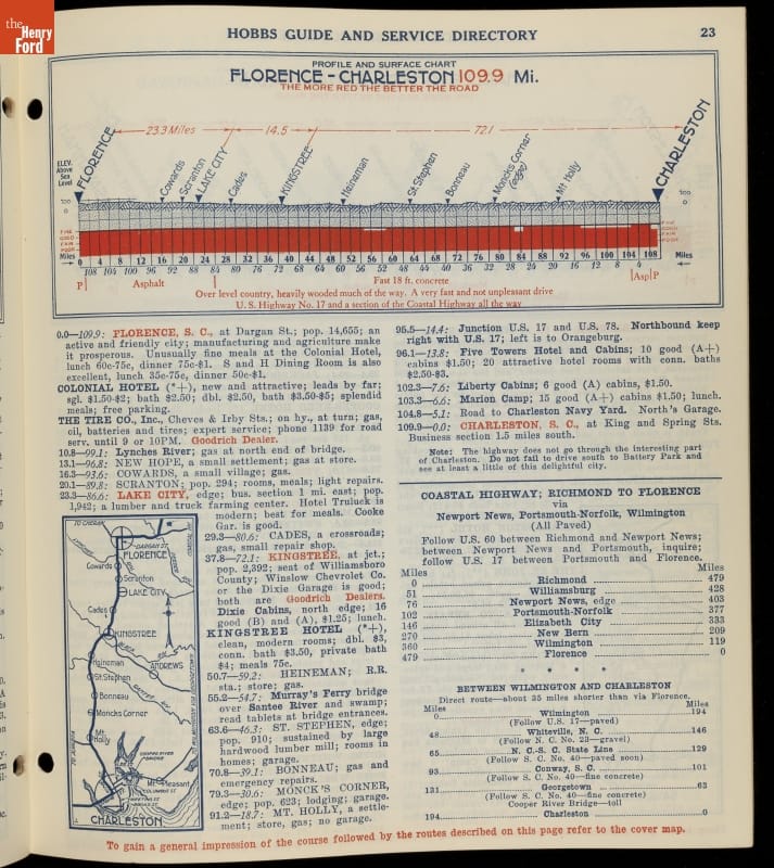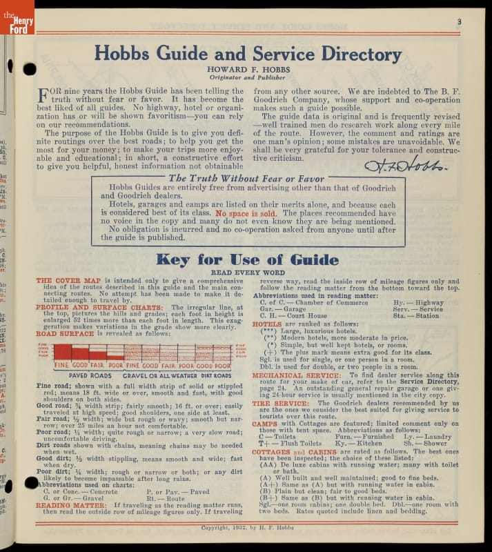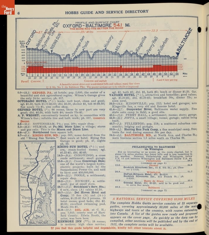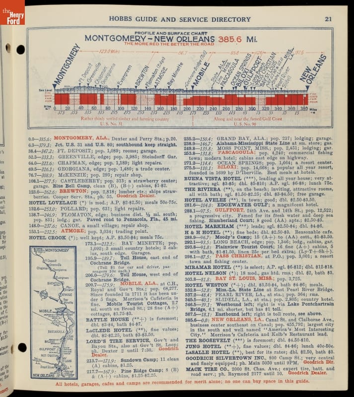 Howard F. Hobbs published a series of travel guides that gave "helpful, honest information not obtainable from any other source." The guides contained a map and road surface quality charts. Also helpful were lists of local hotels, cottages, auto camps, and mechanical services and dealerships. This 1932 guide covered a number of U.S. highways from New York to the Gulf coast.