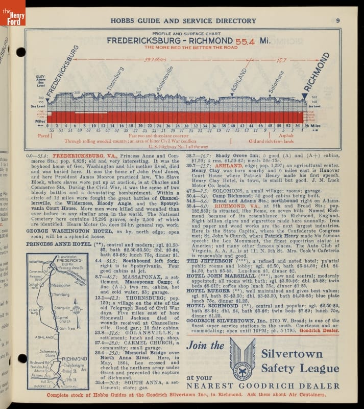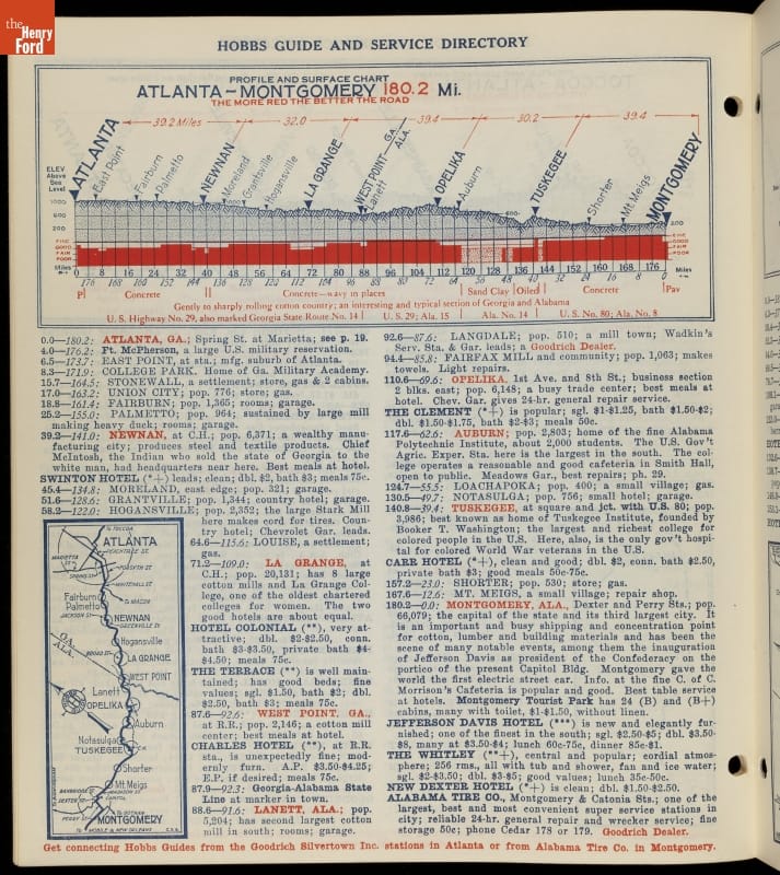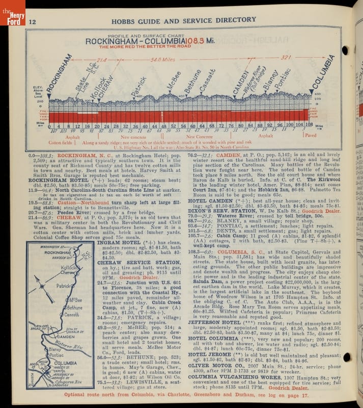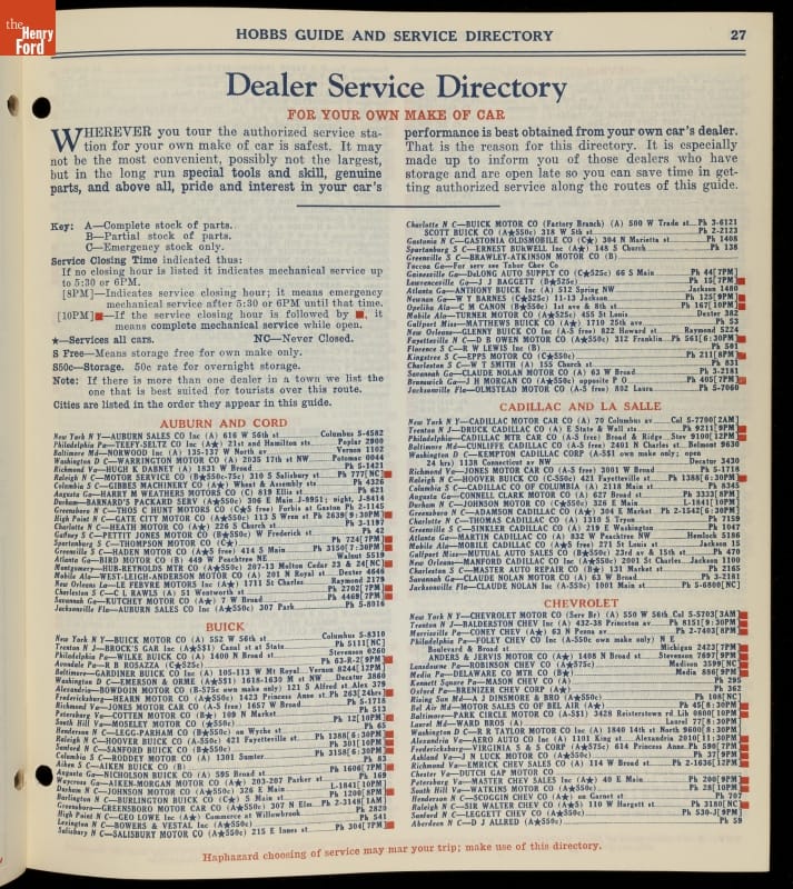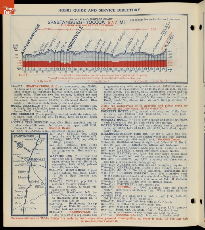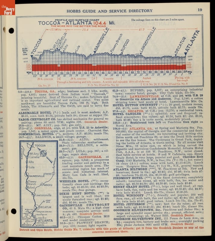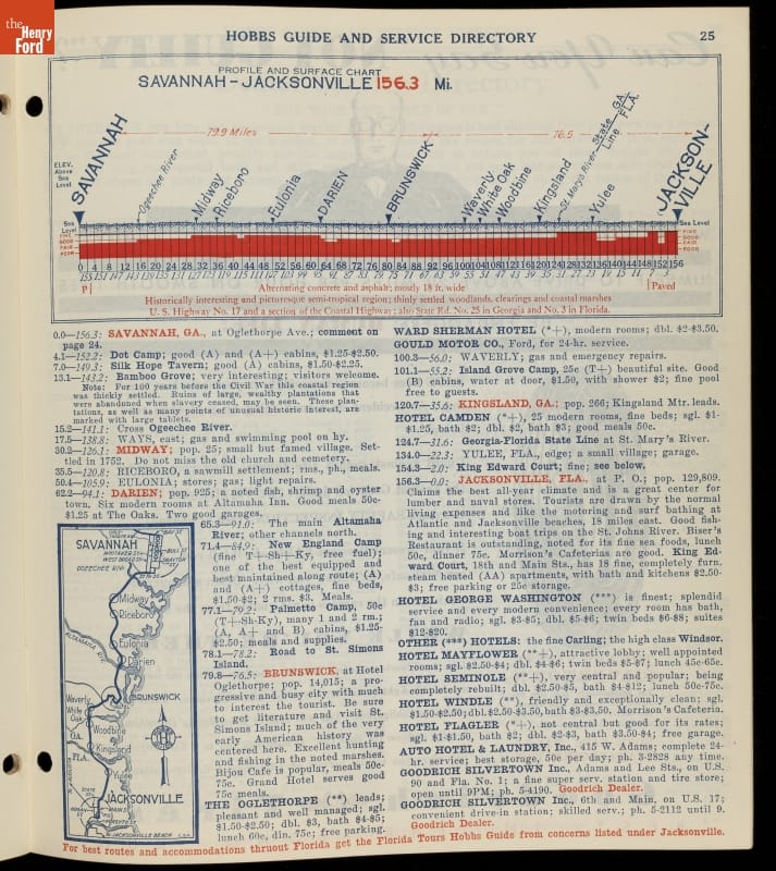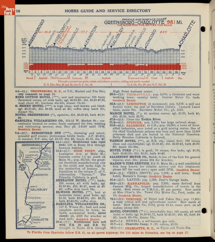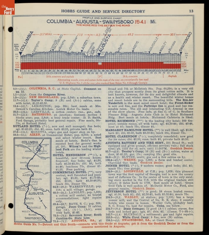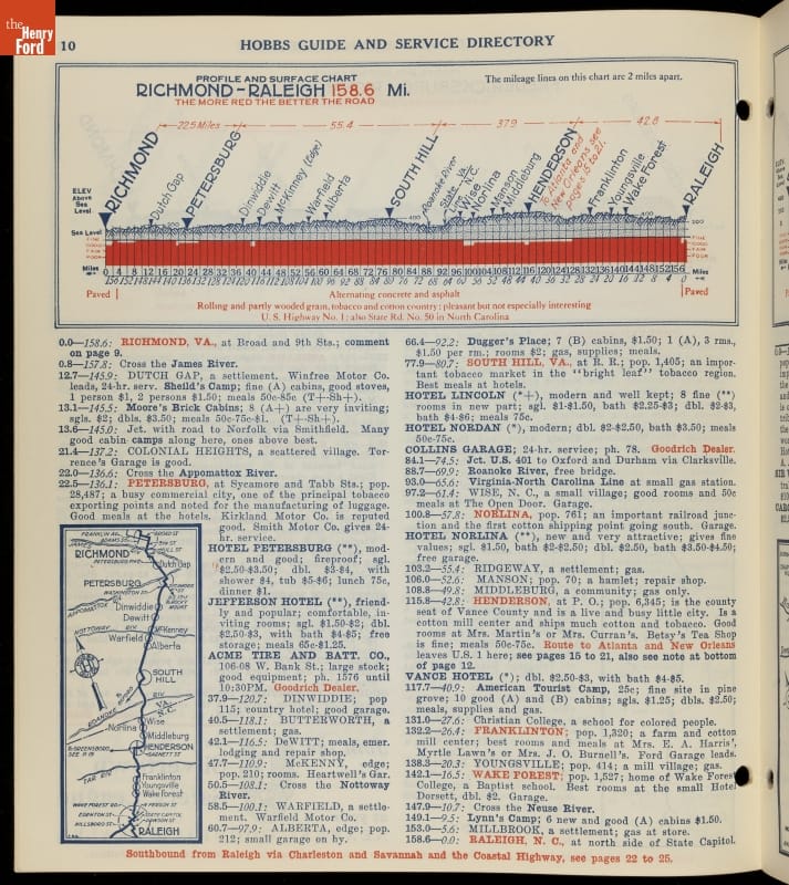 Howard F. Hobbs published a series of travel guides that gave "helpful, honest information not obtainable from any other source." The guides contained a map and road surface quality charts. Also helpful were lists of local hotels, cottages, auto camps, and mechanical services and dealerships. This 1932 guide covered a number of U.S. highways from New York to the Gulf coast.