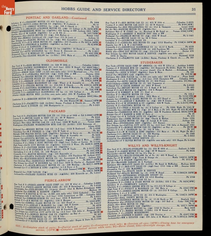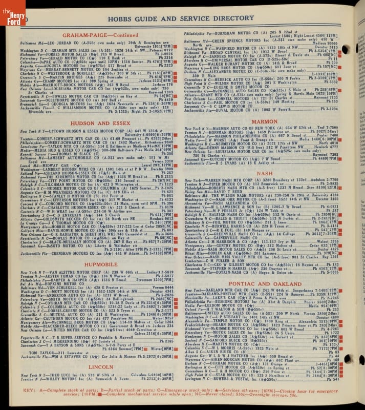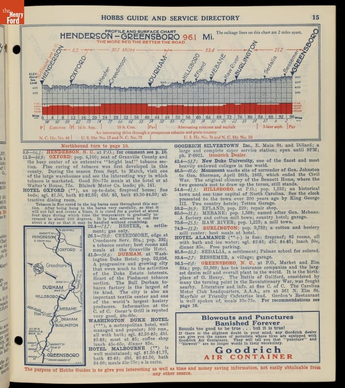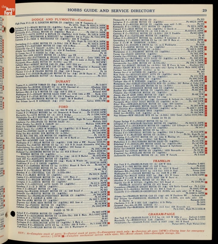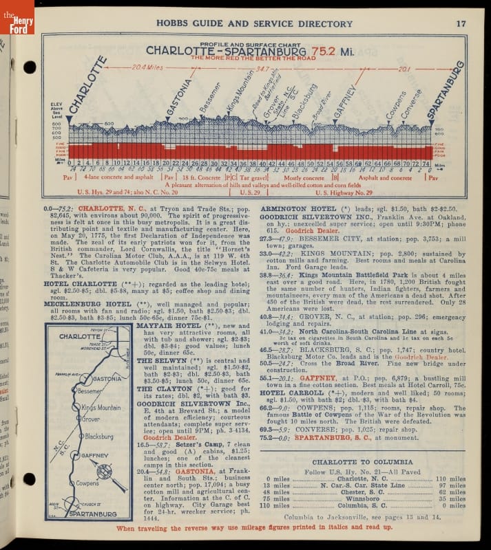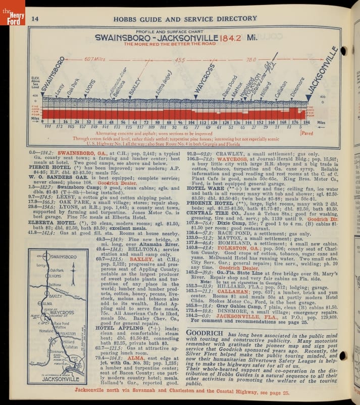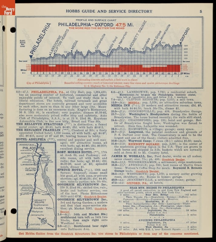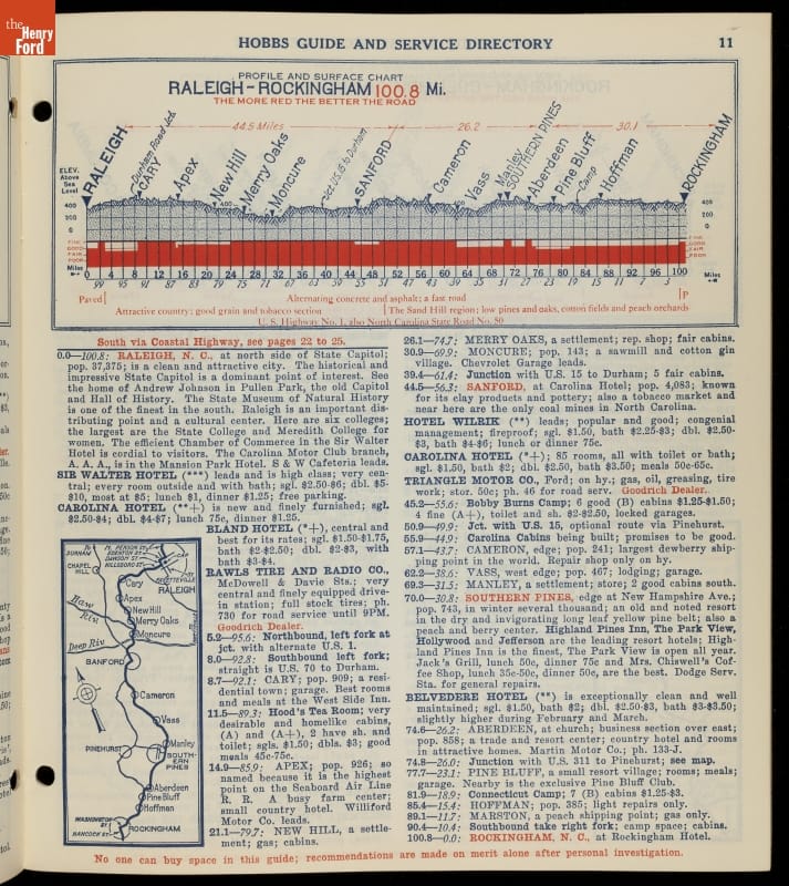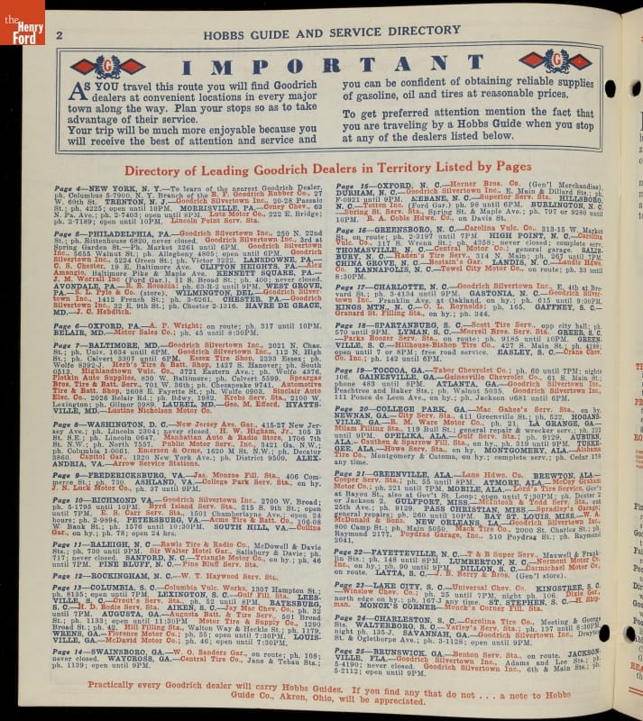 Howard F. Hobbs published a series of travel guides that gave "helpful, honest information not obtainable from any other source." The guides contained a map and road surface quality charts. Also helpful were lists of local hotels, cottages, auto camps, and mechanical services and dealerships. This 1932 guide covered a number of U.S. highways from New York to the Gulf coast.