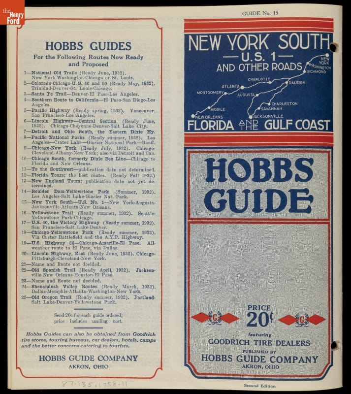 Guide No. 15 / NEW YORK SOUTH / U.S. 1 / AND OTHER ROADS / FLORIDA AND THE GULF COAST / HOBBS GUIDE / PRICE / 20C / featuring / GOODRICH TIRE DEALERS / PUBLISHED BY / HOBBS GUIDE COMPANY / AKRON, OHIO